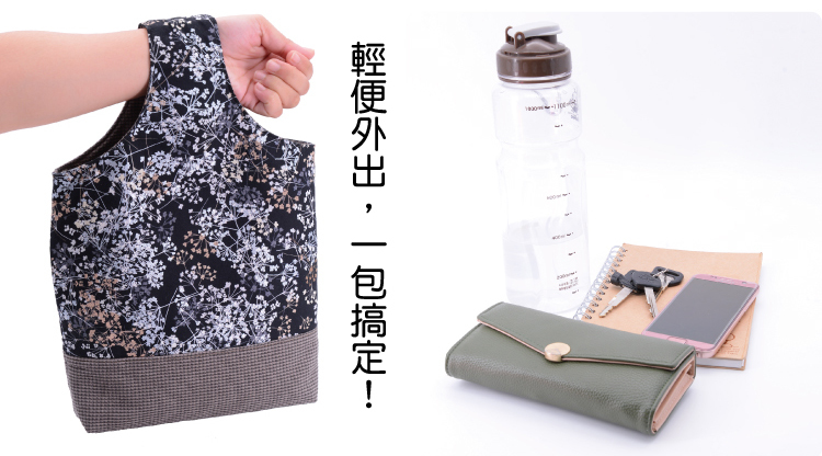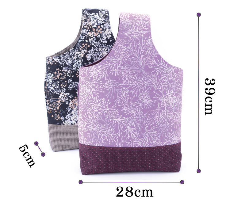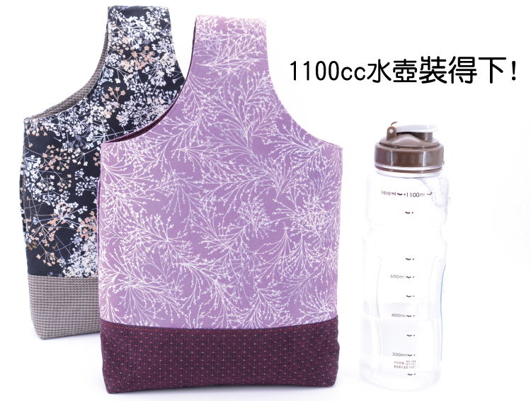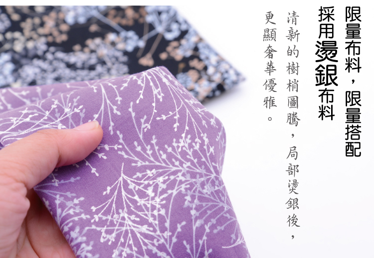 上袋身 : 採用進口燙銀棉布,不同角度的光線下樹梢閃閃發亮,讓你總是低調的吸睛。下袋身及裡布 : 採用MIT台灣羽織的先染布,兩者搭配之下,漂亮的布總是能讓你的手作包更加分。