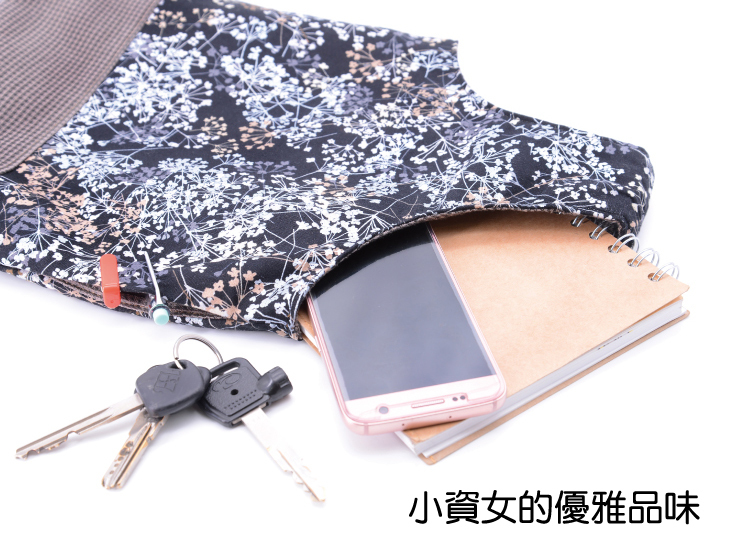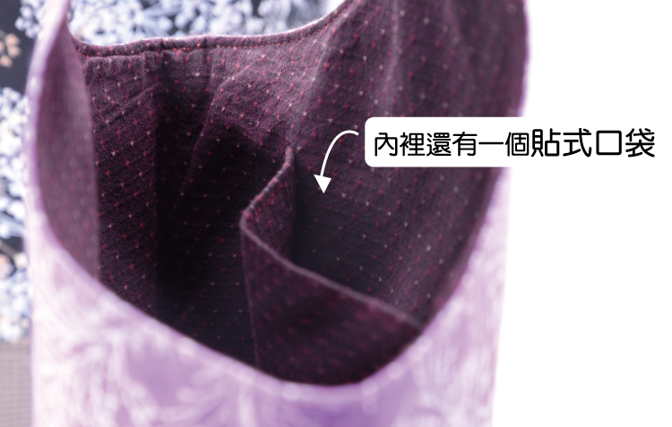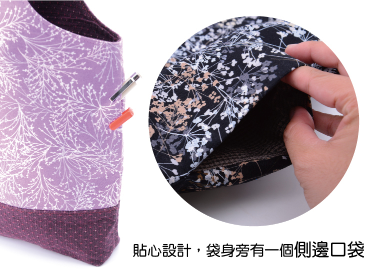 袋子結構 : 在側邊加入一個小口袋可以放置小物,另外裡袋也有貼式口袋,輕鬆收納有條理。