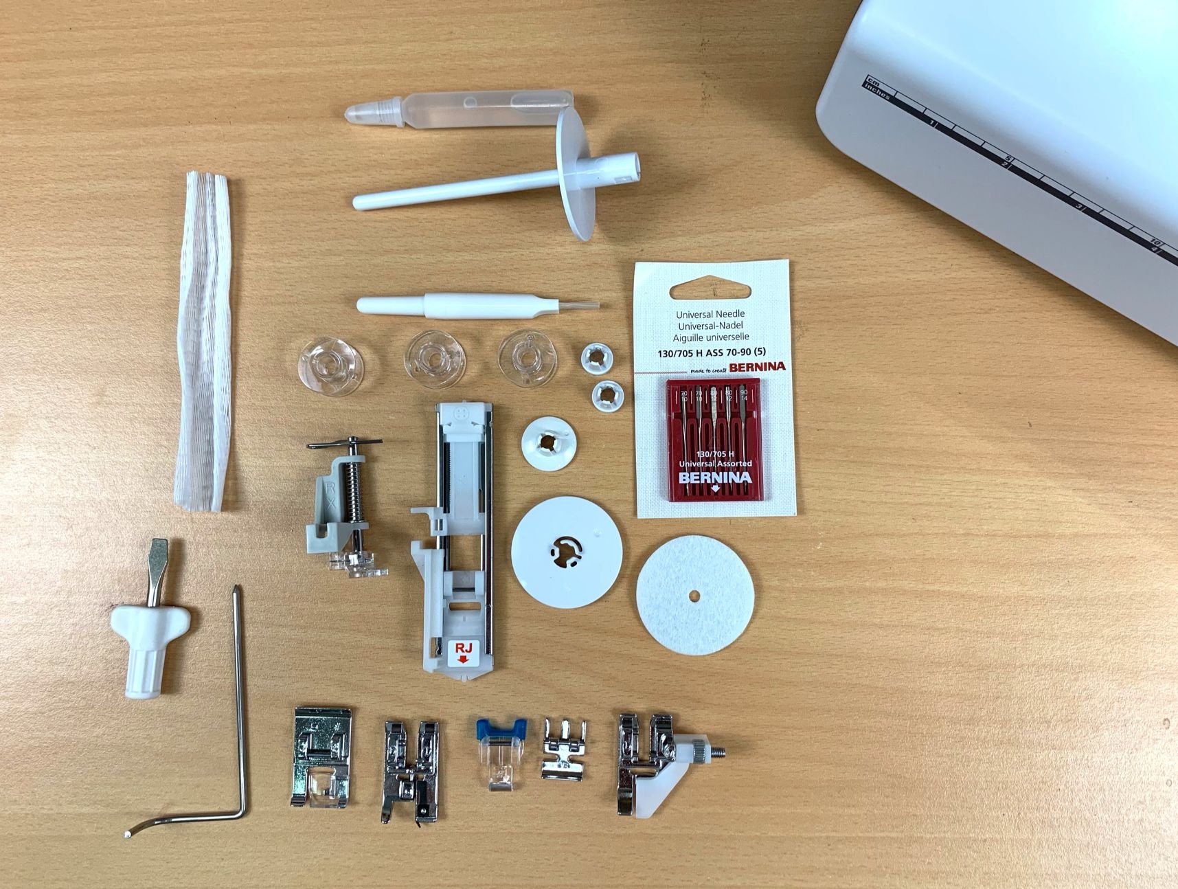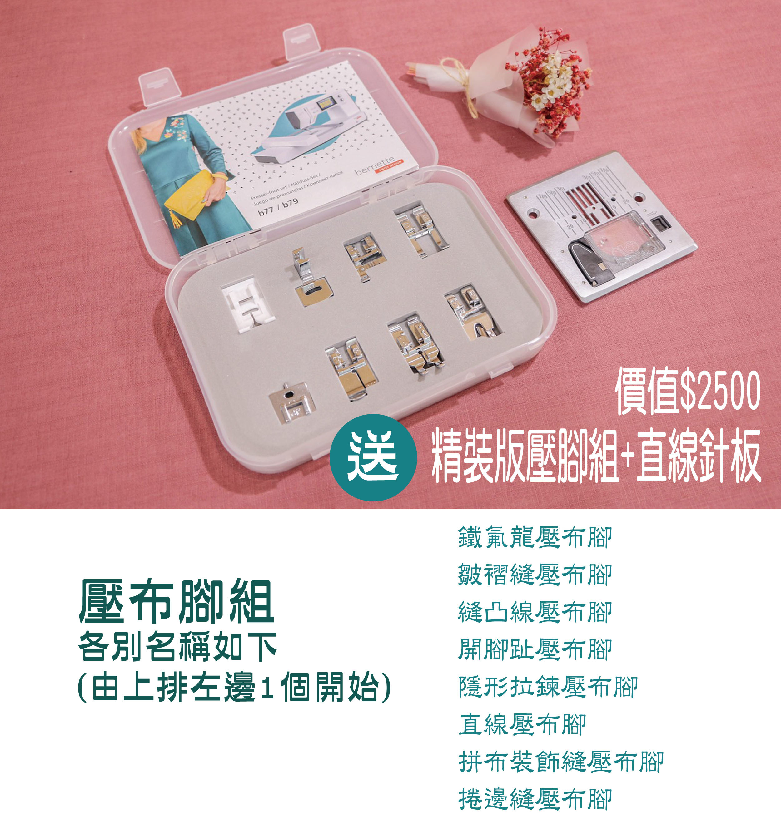 從水平導引器,方便壓線,還有開扣眼壓布腳,縫扣子的壓布腳,盲縫壓腳,拷克壓布腳,拉鍊壓布腳,第二線軸等都會附在裡面