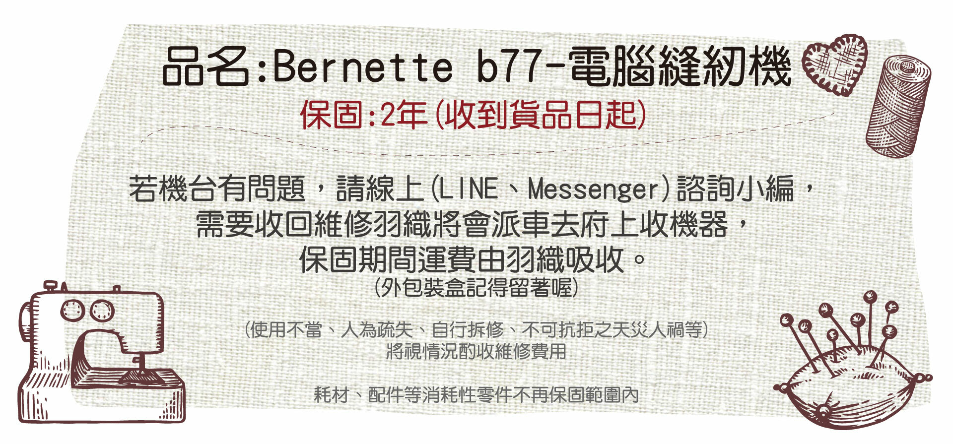 bernette為bernina的子品牌,bernina在縫紉機裡面的勞斯萊斯,這次,bernette b77就是瑞士設計,台灣研發生產,讓我們來看看這台聰明的縫紉機囉!