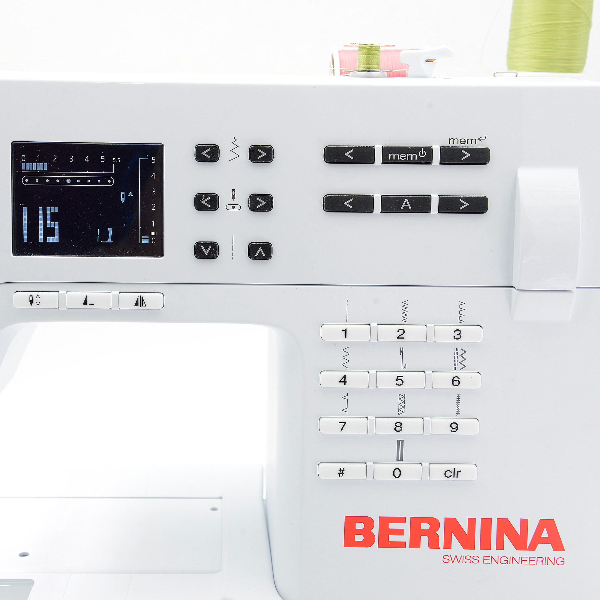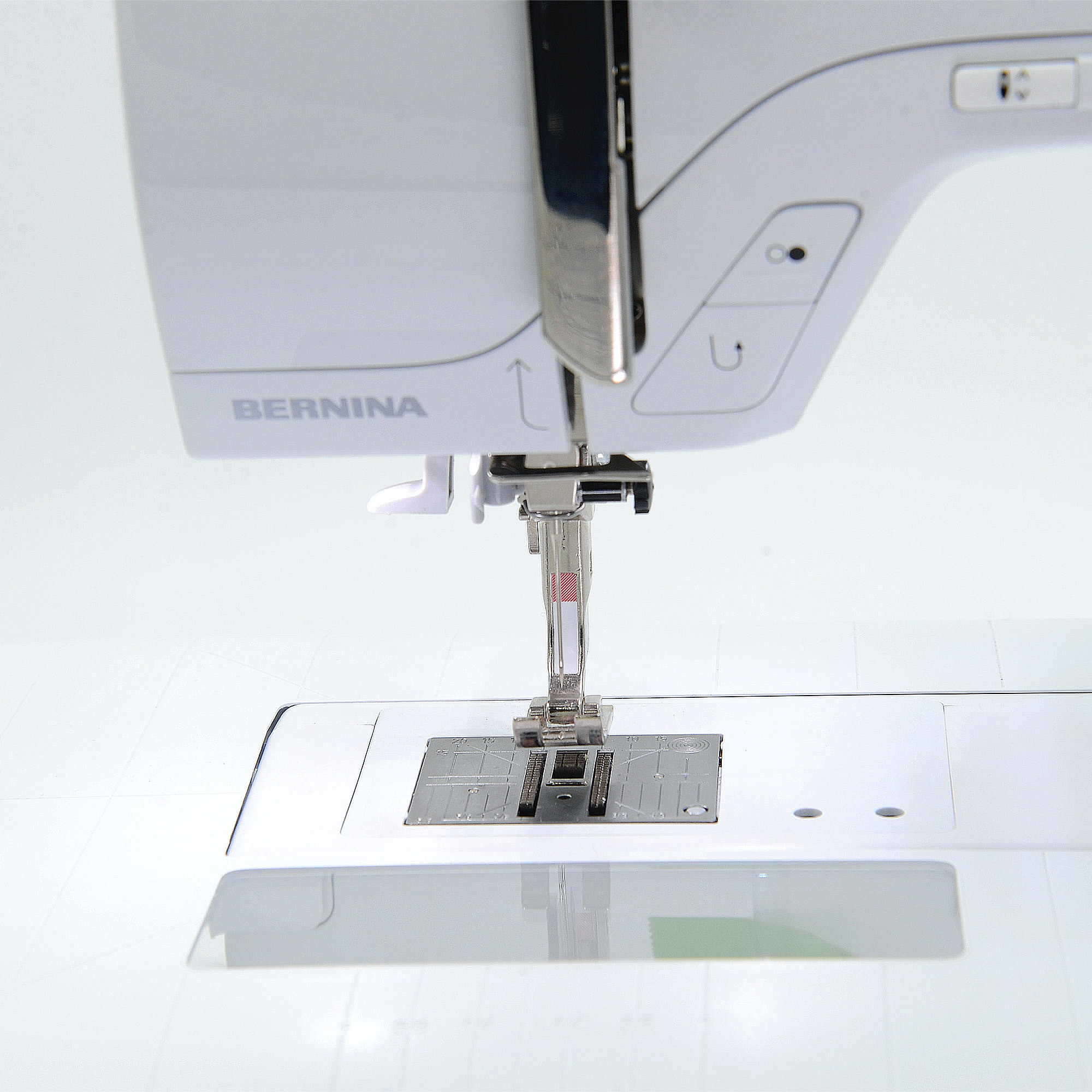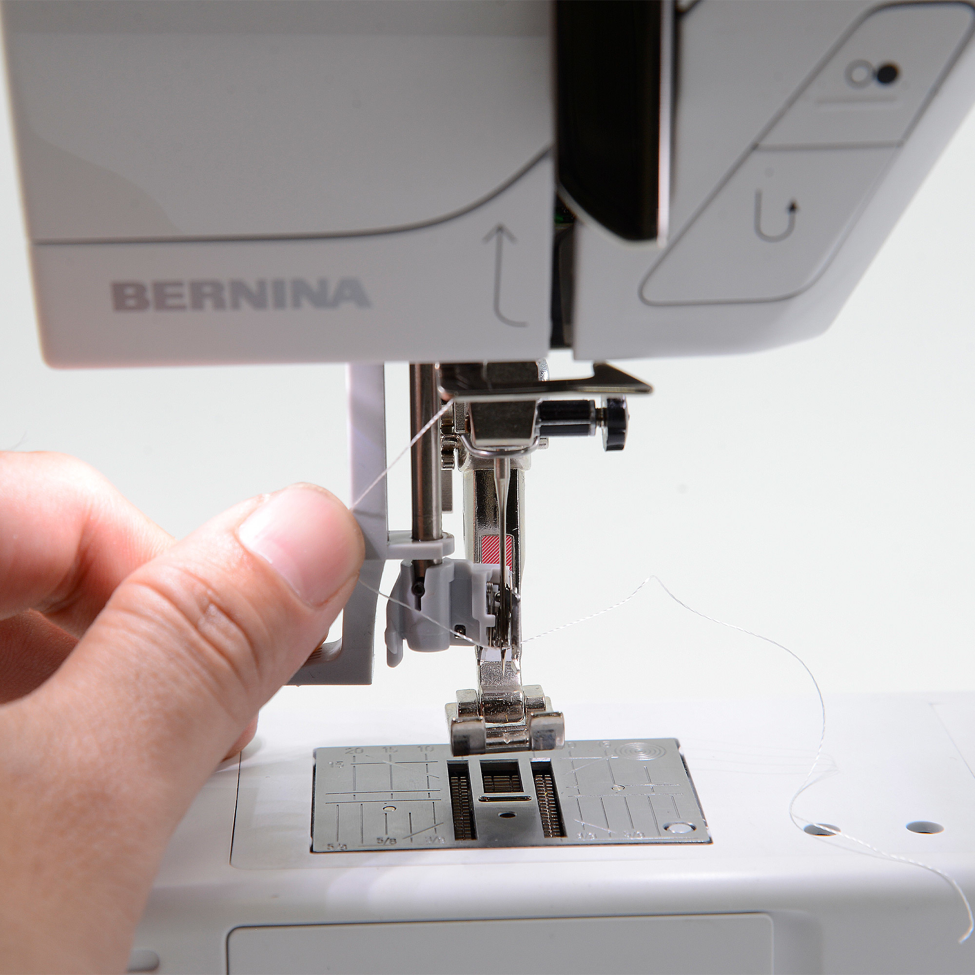 自動穿線,一般的縫紉機在穿線的時候,如果針桿停留的位置不對,就無法穿線,但是在bernina裡面,每一次的穿線,穿線輔助器會隨著你的針桿上下的移動,如果位置真的太低,也會有安全機制不讓你穿線,這樣的好處是,你的穿線器不會因為位置的錯誤導致穿線器壞掉