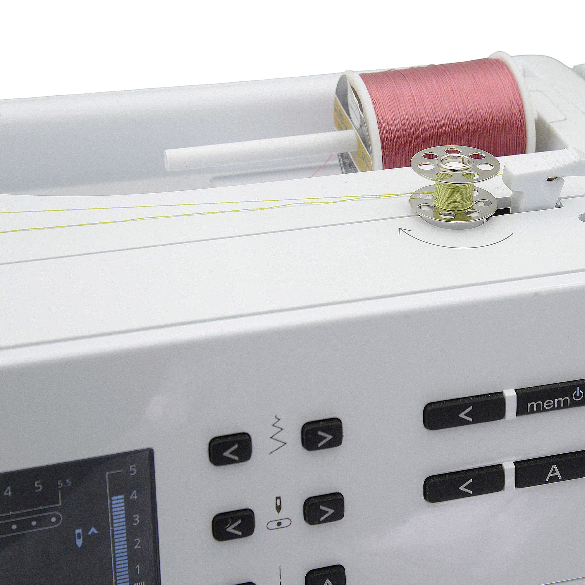 在每一次車縫的時候,你可以不需要把你車縫的線重新拉出,他有第二線軸,可以讓你在車縫中萬一要捲底線,直接穿線繞底線就可以囉!