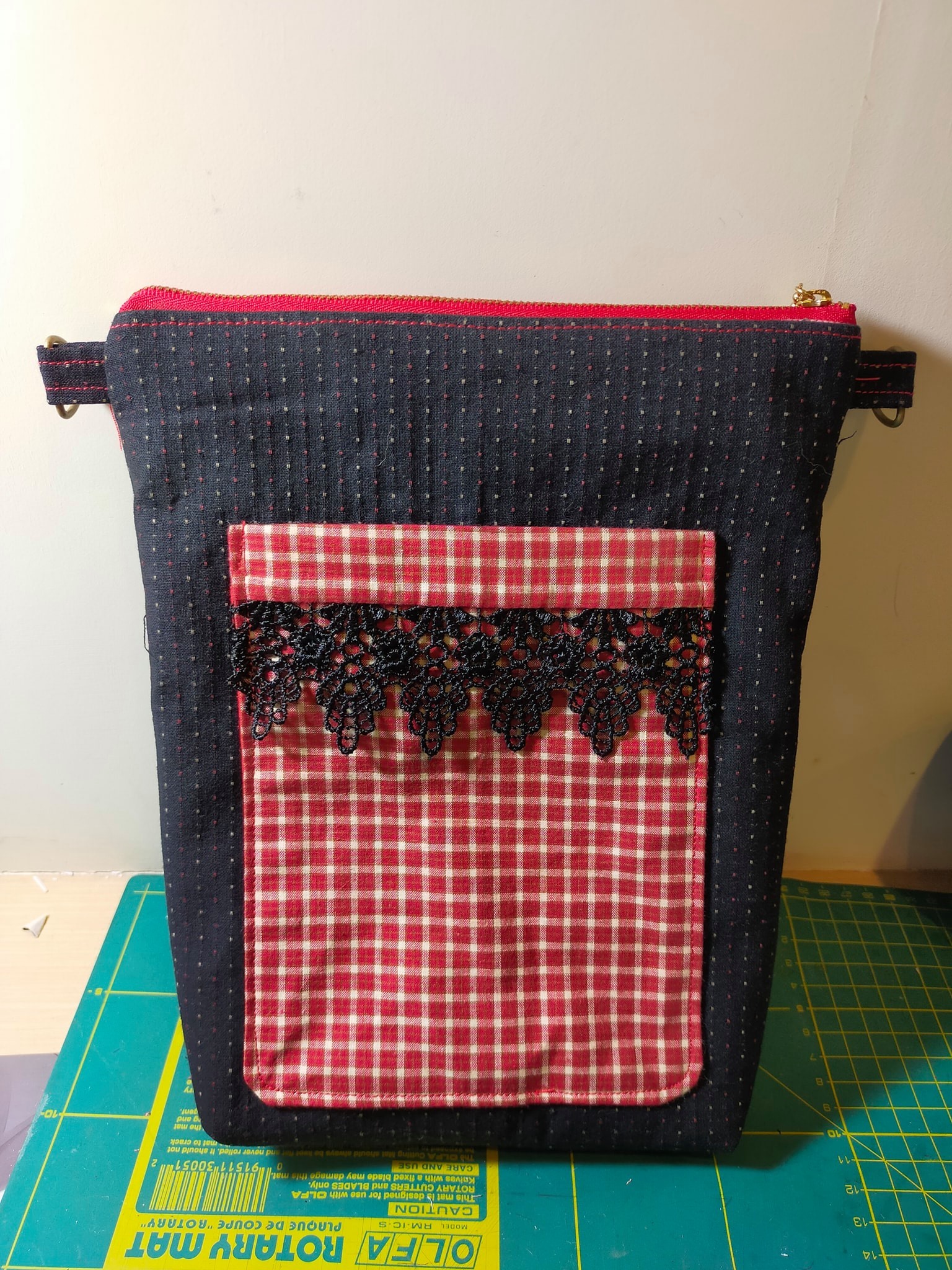 完成了也!今天收到布,哇!好大一塊喔!雙幅一碼也!在想要做什麼呢?一直想要幫平板做個袋子,正好可以試試,於是在網上找資料,剛好找到三年前羽織羅老師的視頻,就參考著做了,因為家裡有紅格子布、黑蕾絲,紅色拉鍊,就用上了。先染布的好處是正反都可以用,所以另一面就利用布的正反做變化,因為家裡沒有適合的裡布,所以直接利用同一塊布做裡布,一切都那麼剛好。感謝羽織、感謝主!