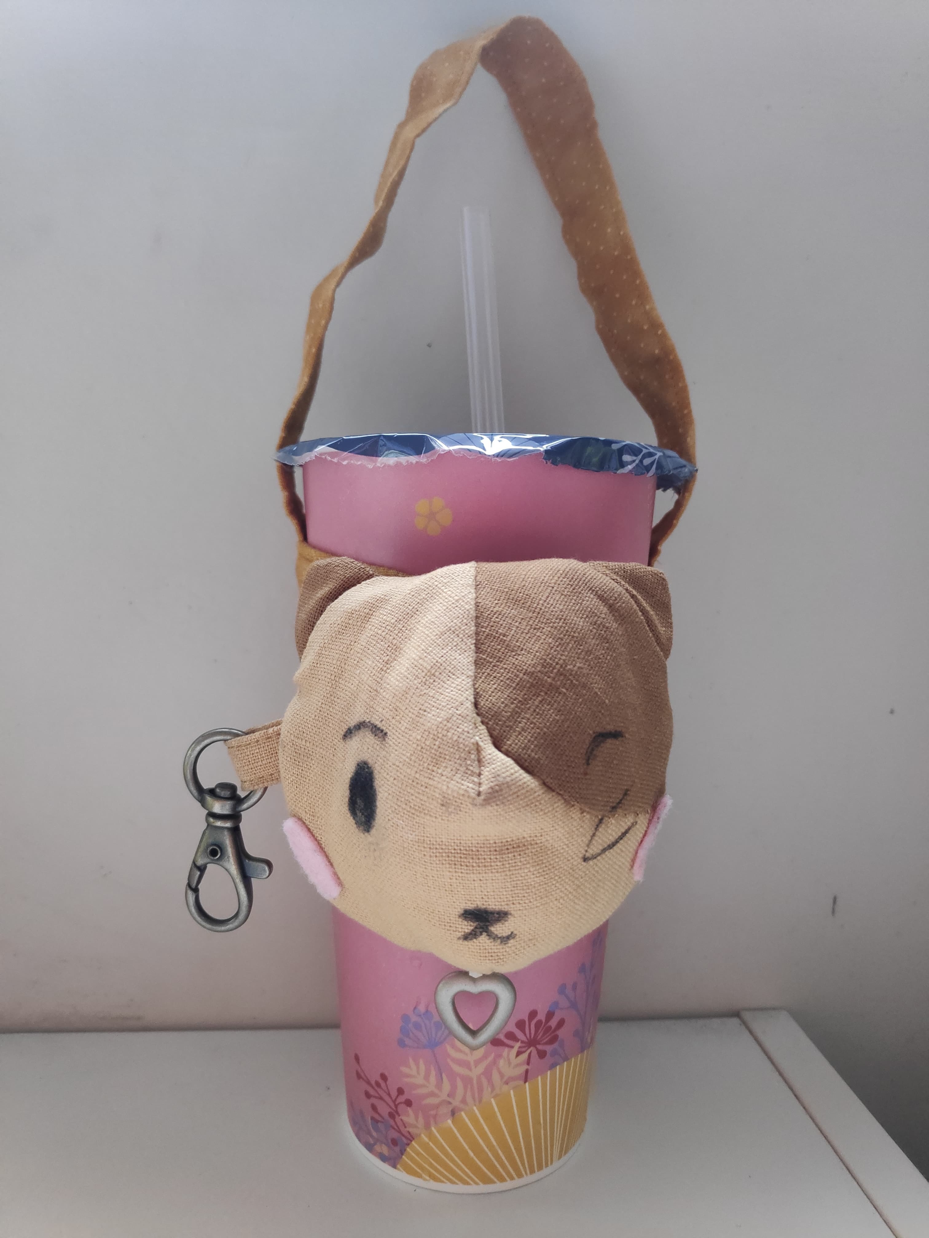 沒想過杯套也可以這樣收納,平常沒用時可掛在包包上當吊飾,但當愛去買咖啡或手搖飲就可以馬上拿下來使用,變成飲料提袋,不像平常要在包包裡翻半天才找到提袋或花錢買塑膠袋,是款可愛、實用又環保的飲料提袋。