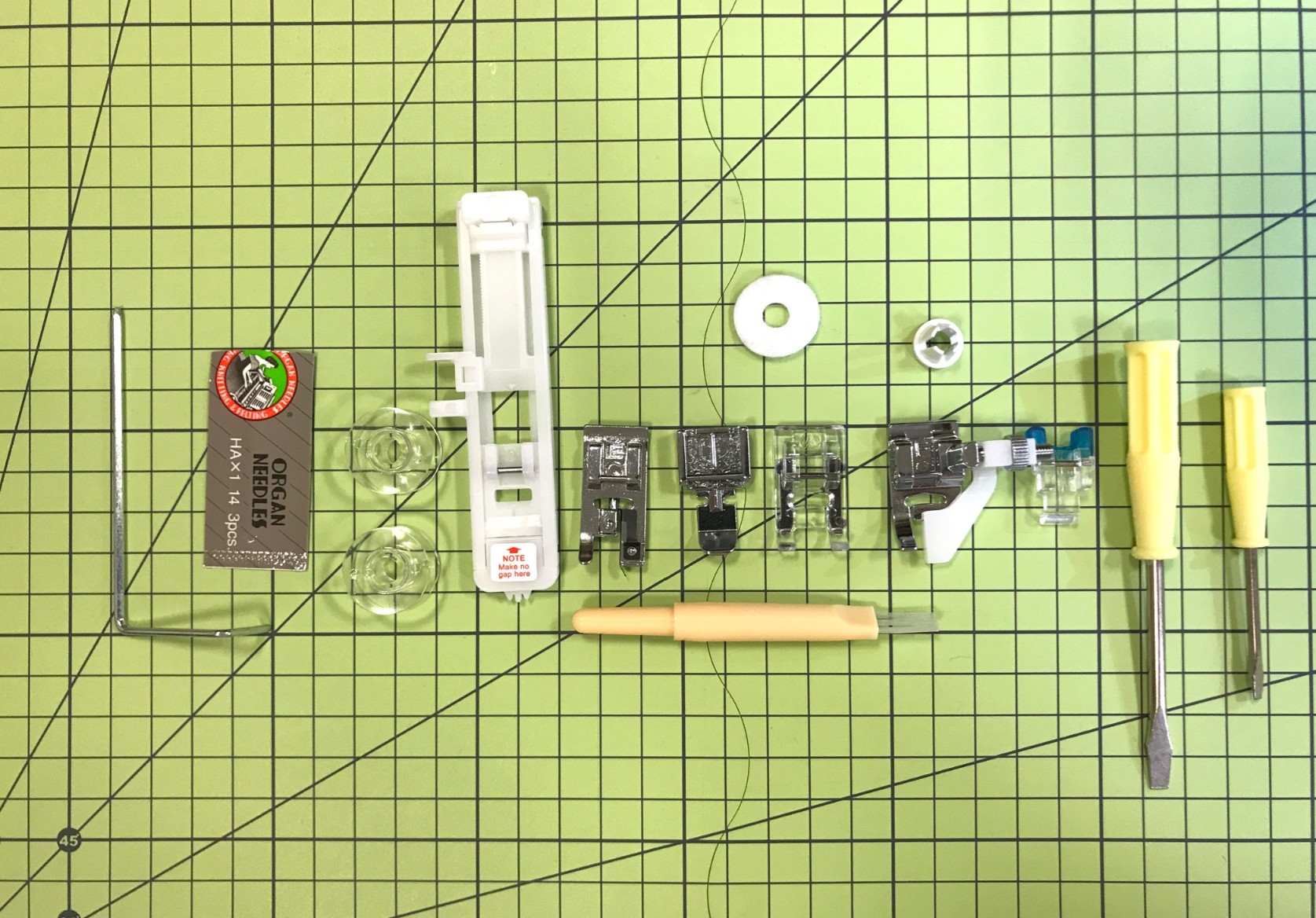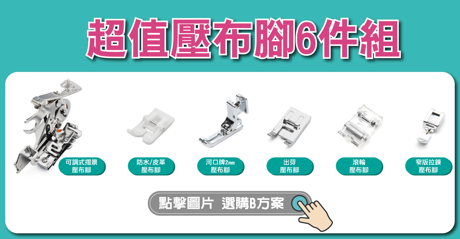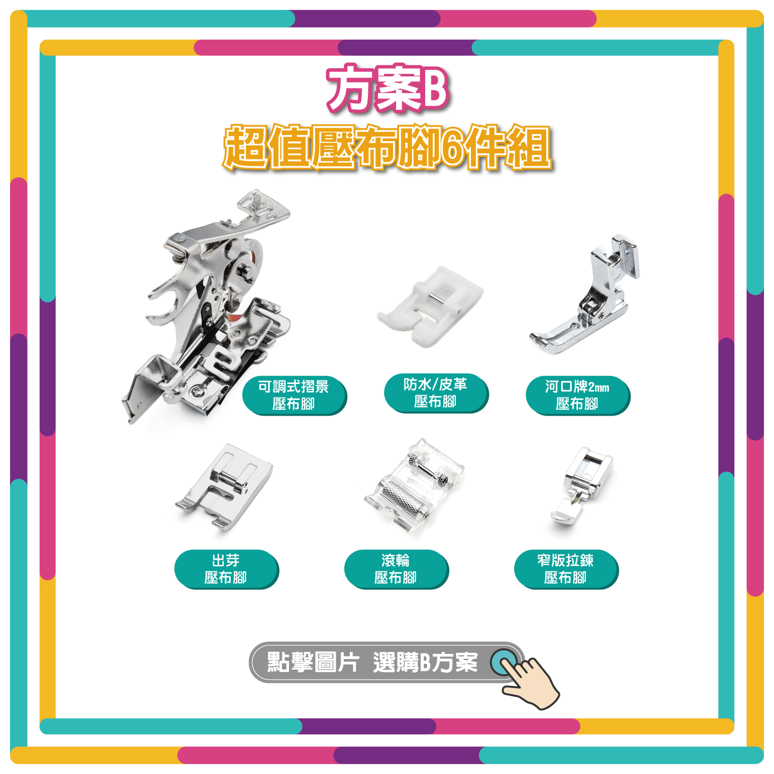 從水平導引器,方便壓線,還有開扣眼壓布腳,縫扣子的壓布腳,盲縫壓腳,拷克壓布腳,拉鍊壓布腳,第二線軸等都會附在裡面,另外全繁體中文說明書也會一併附上