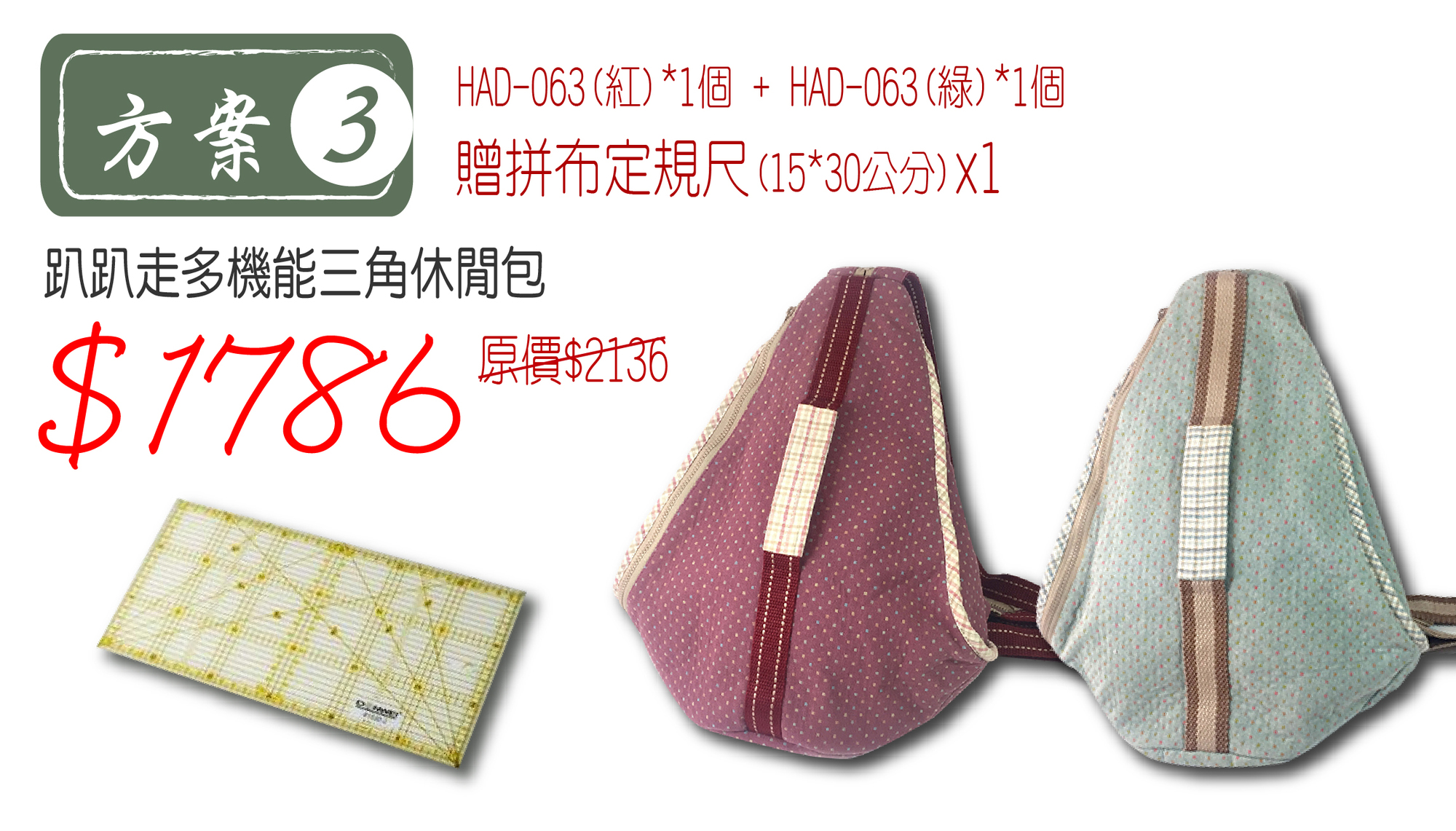 內容物:趴趴走多機能三角休閒包(紅)材料包*1組+趴趴走多機能三角休閒包(綠)材料包*1組+贈品:拼布定規尺(15cm*30cm)*1支