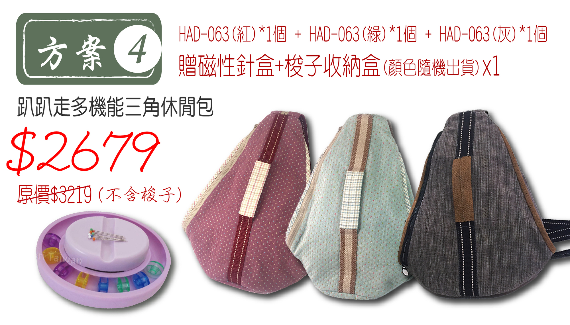 內容物:趴趴走多機能三角休閒包(紅)材料包*1組+趴趴走多機能三角休閒包(綠)材料包*1組+趴趴走多機能三角休閒包(灰)材料包*1組+贈品:(磁吸珠針收納盒+梭子收納盒)*1組
