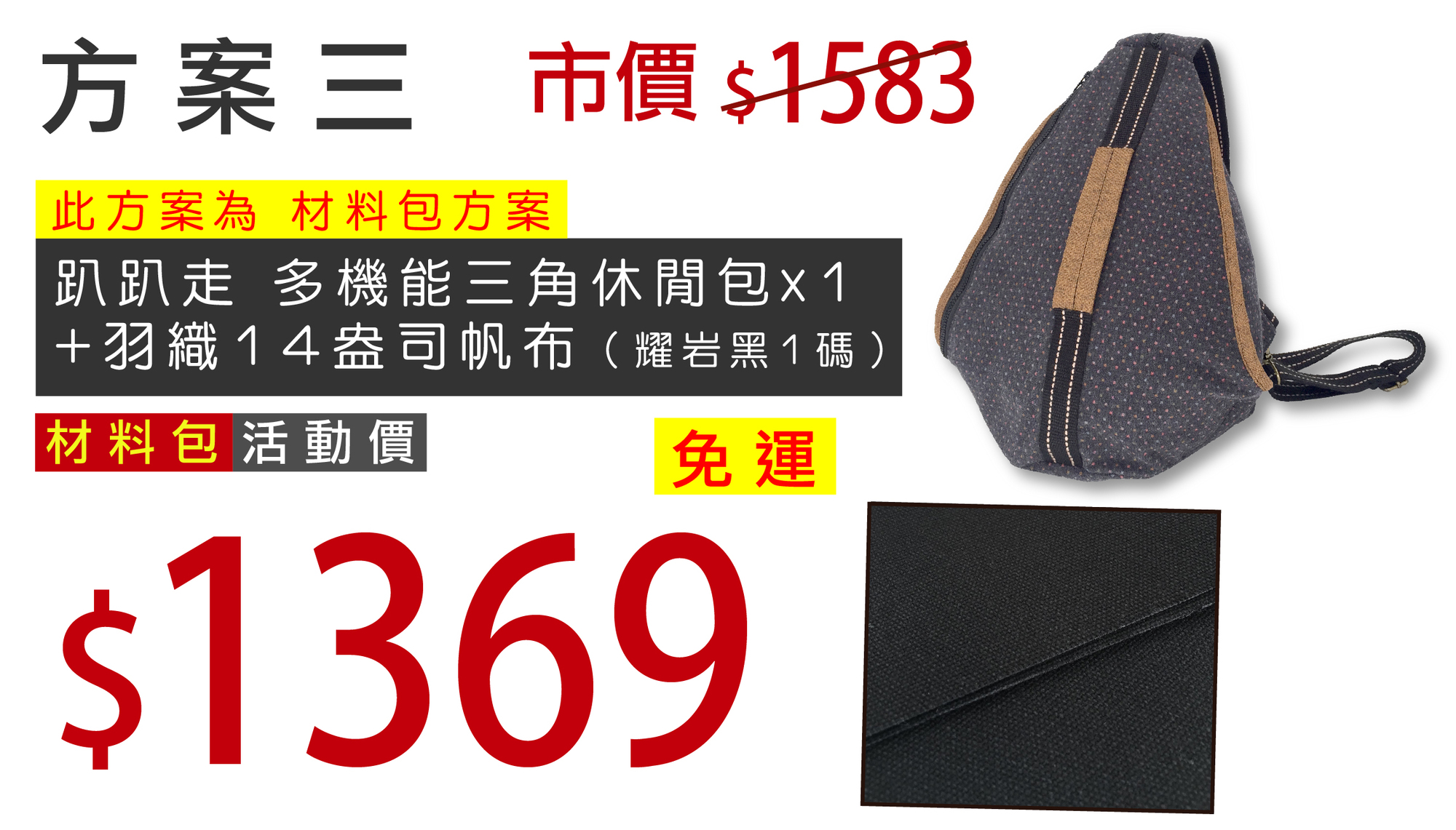 內容物:方案3=>內容物:趴趴走多機能三角包材料包*1組+黑色14盎司羽織專用帆布*1碼