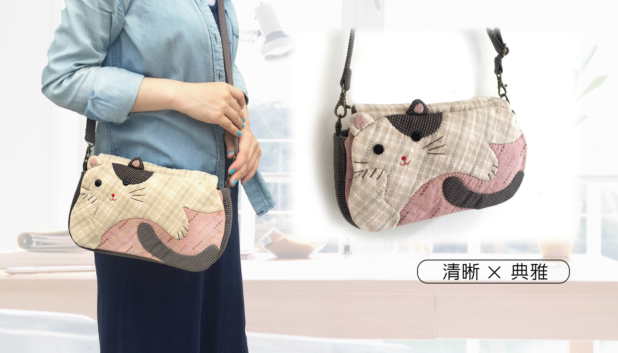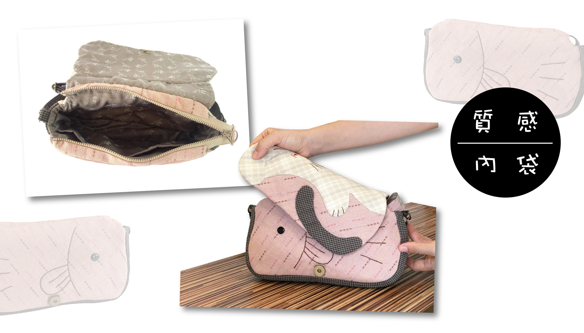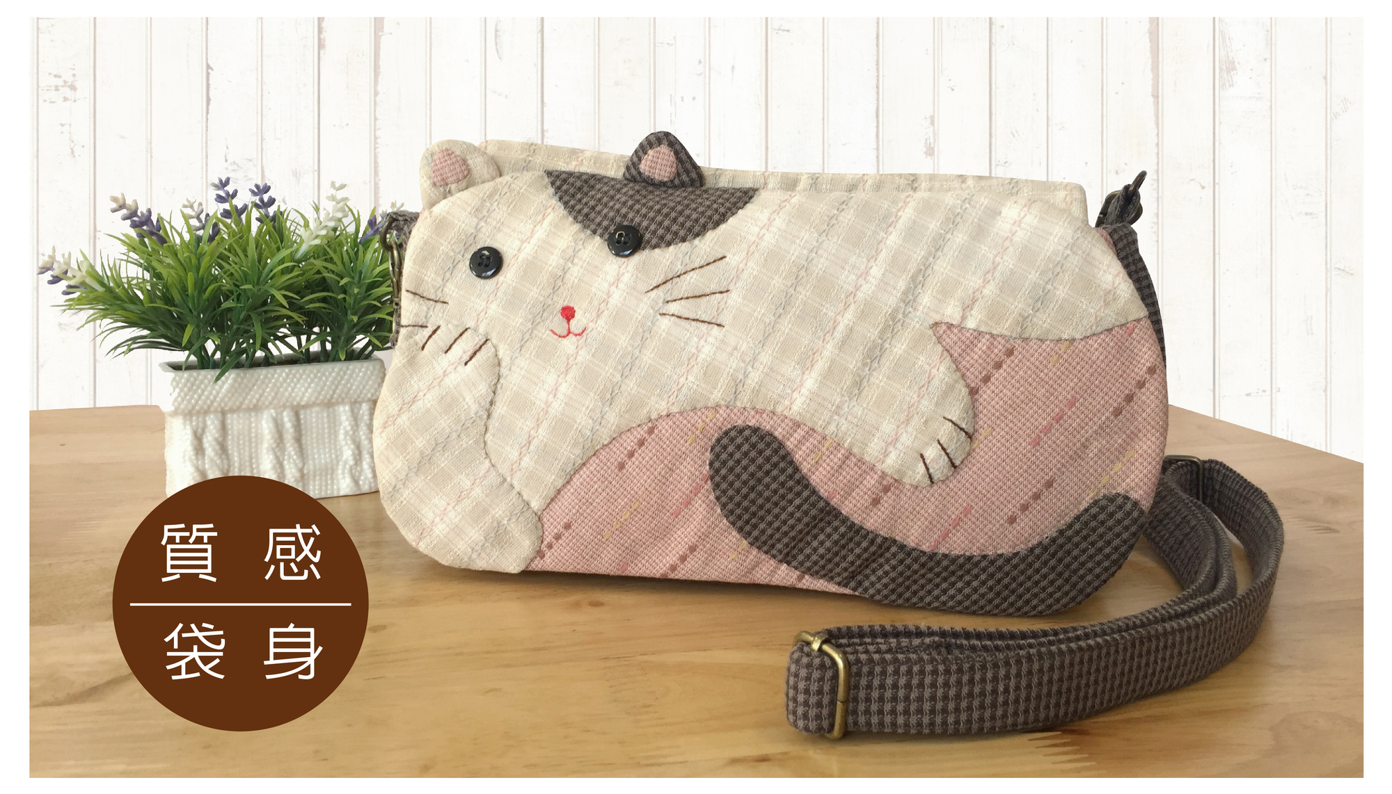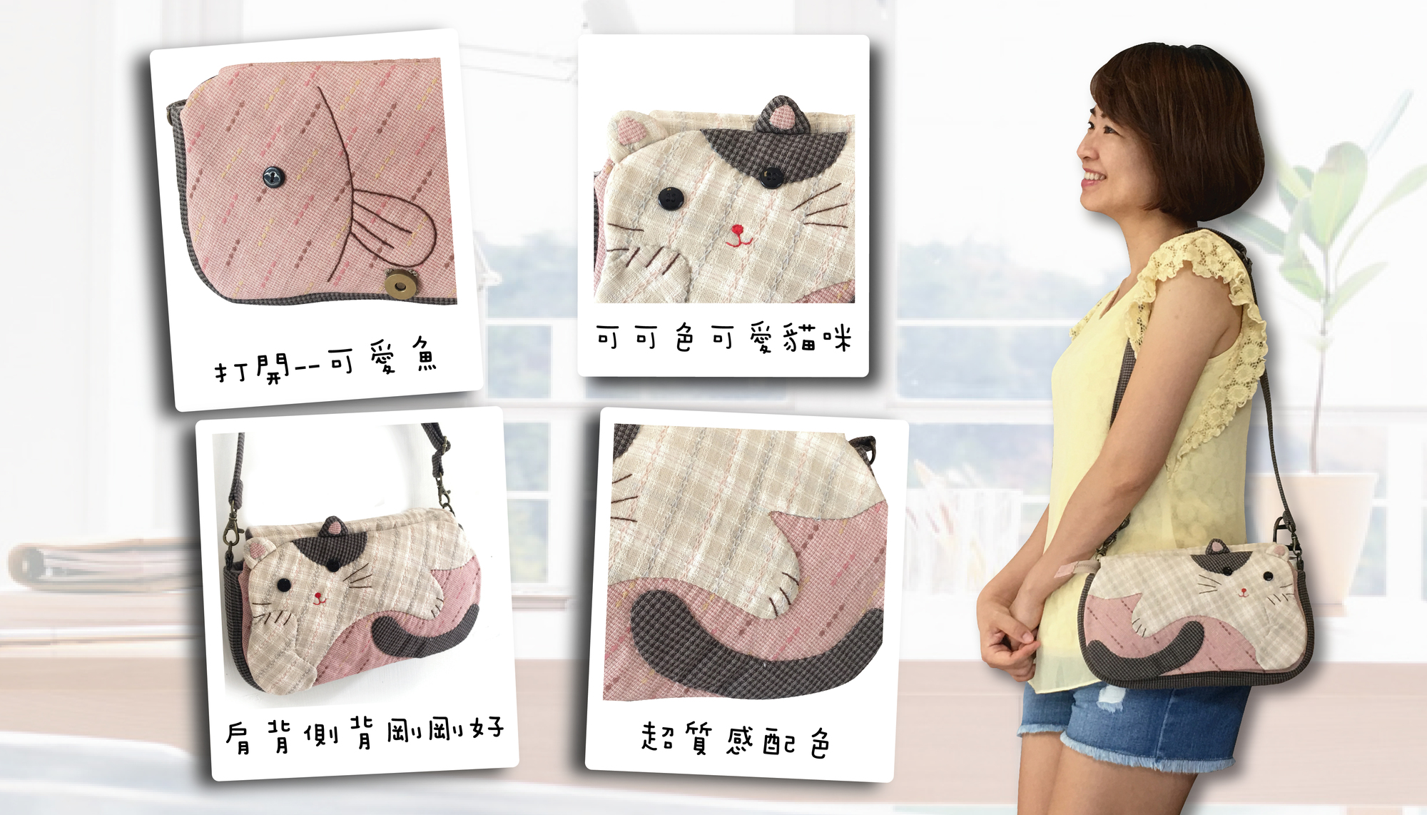 這次要新登場的是一款側背包,在表面設計,將貓咪慵懶,無憂無慮生活,放置在作品表面上,打開袋物時,在裡面加上貓咪最愛玩耍的夥伴,小小魚,前端運用圖像,讓整體袋物除了可愛,多了一分特殊感,整體的材料包走向就是可愛,典雅,卻不掩青春,背上吧!