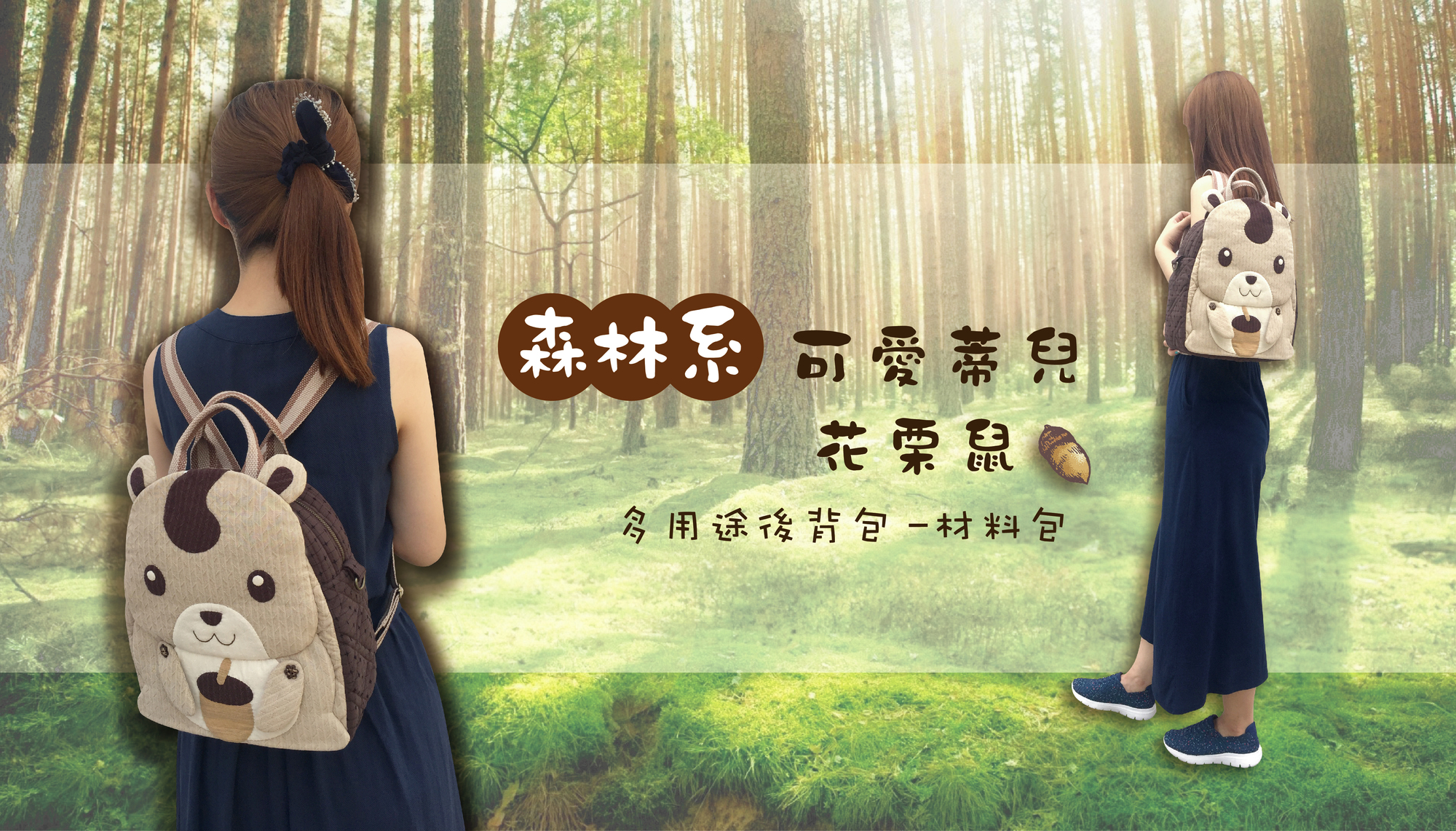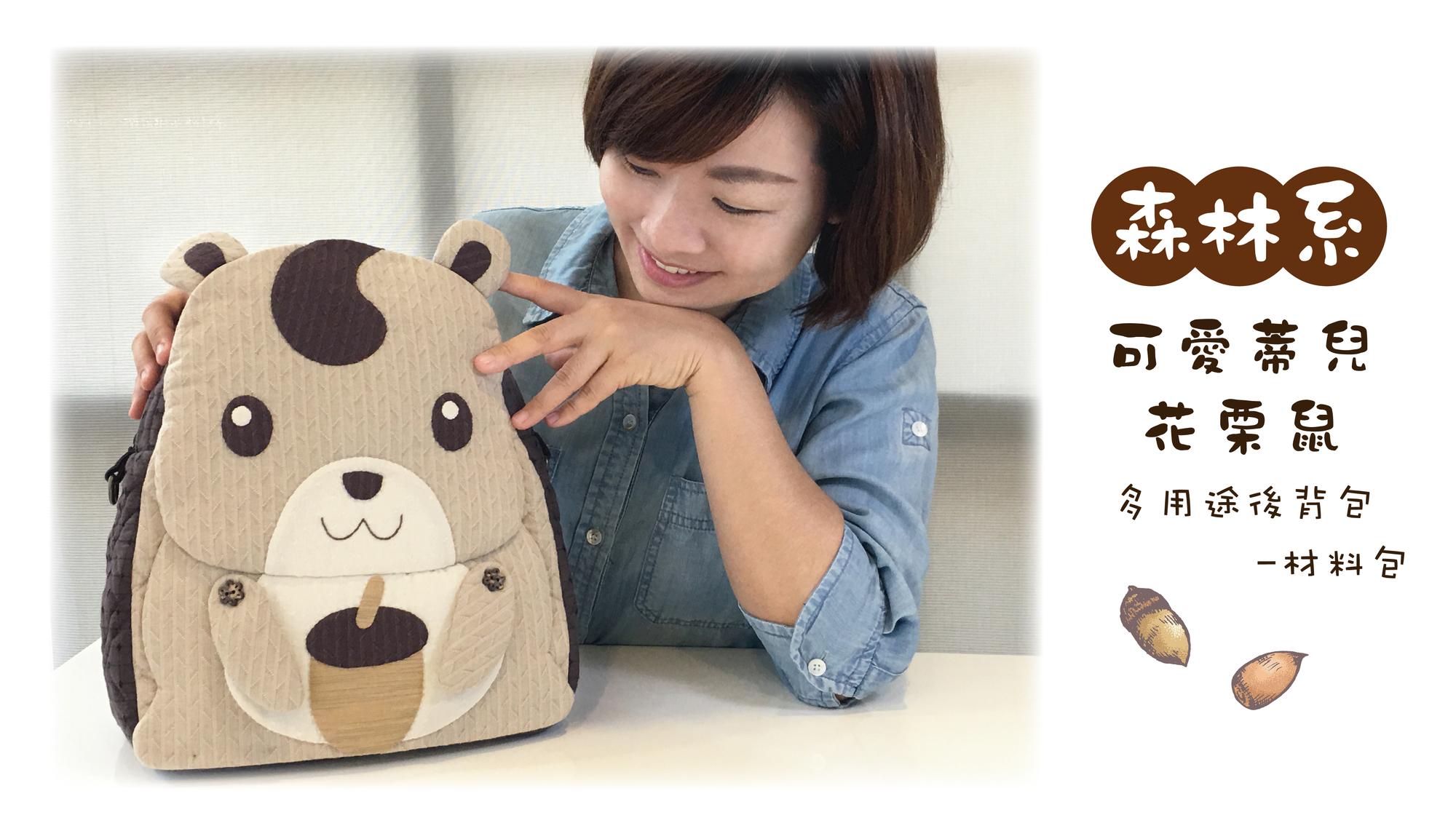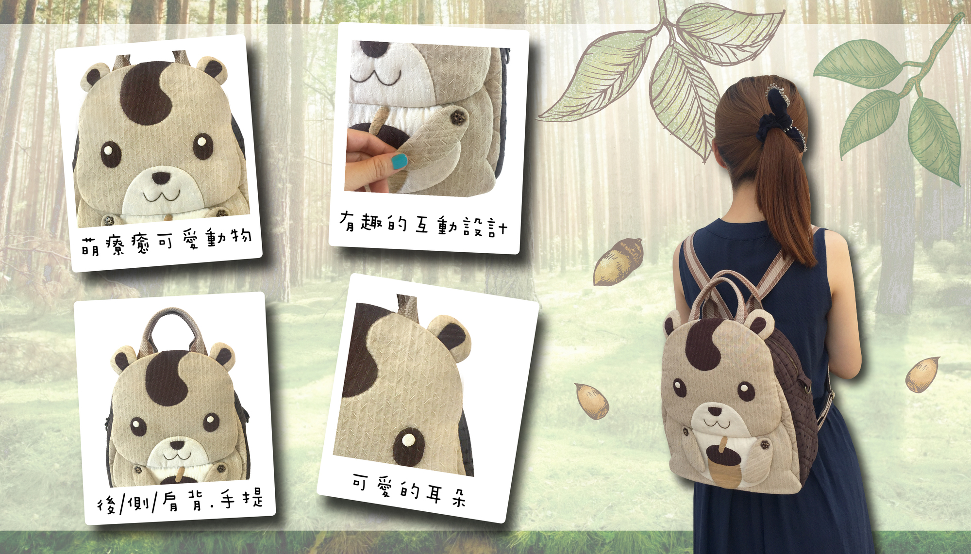 在袋身的圖案設計,將森林的好朋友~花栗鼠,天真可愛表情,放置在作品表面上。