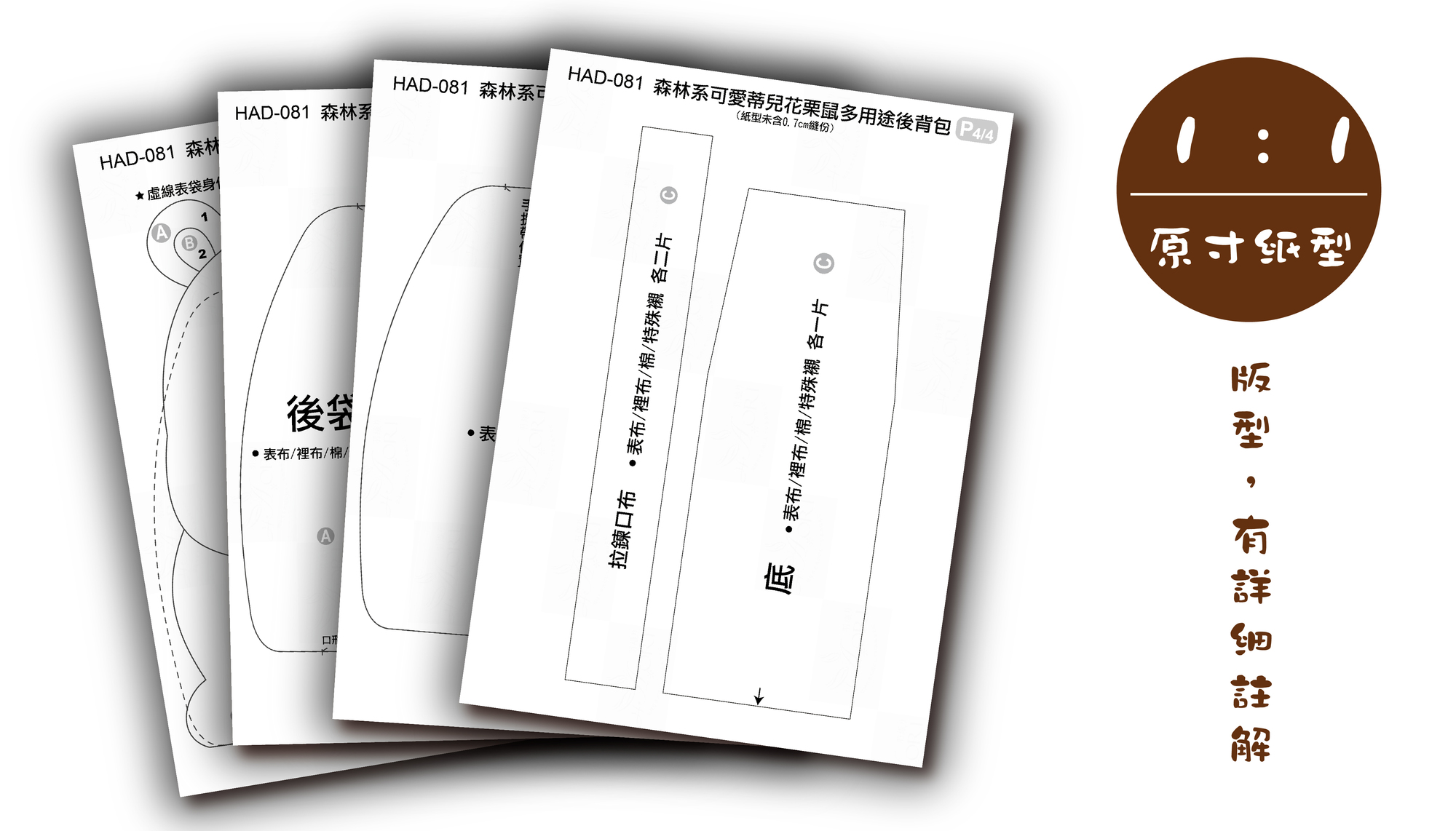 羽織材料包裡頭的紙型說明書,全部採用1:1紙型,並且不會將紙型重疊印製在一張紙上,為的就是讓妳更清楚知道,每一個紙型的用途與方向