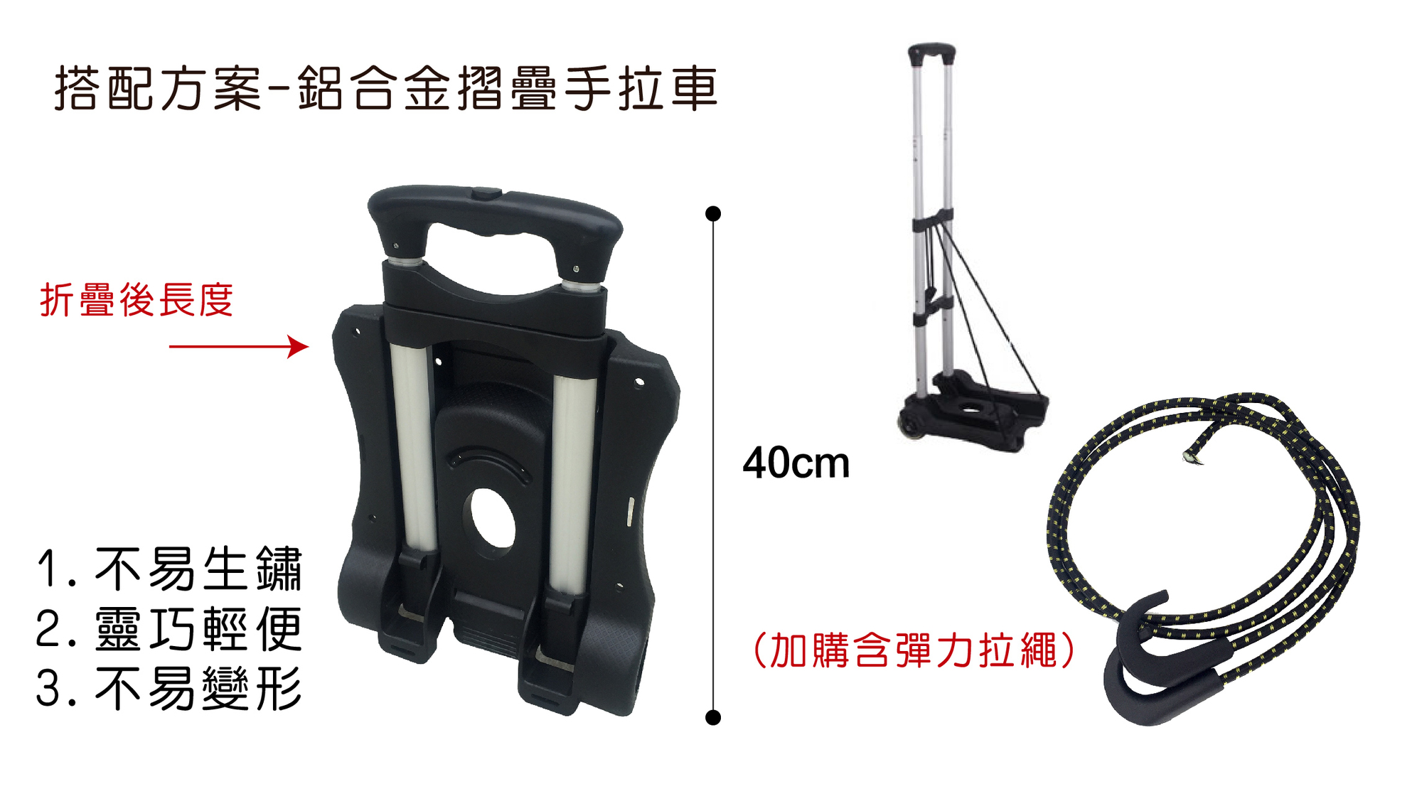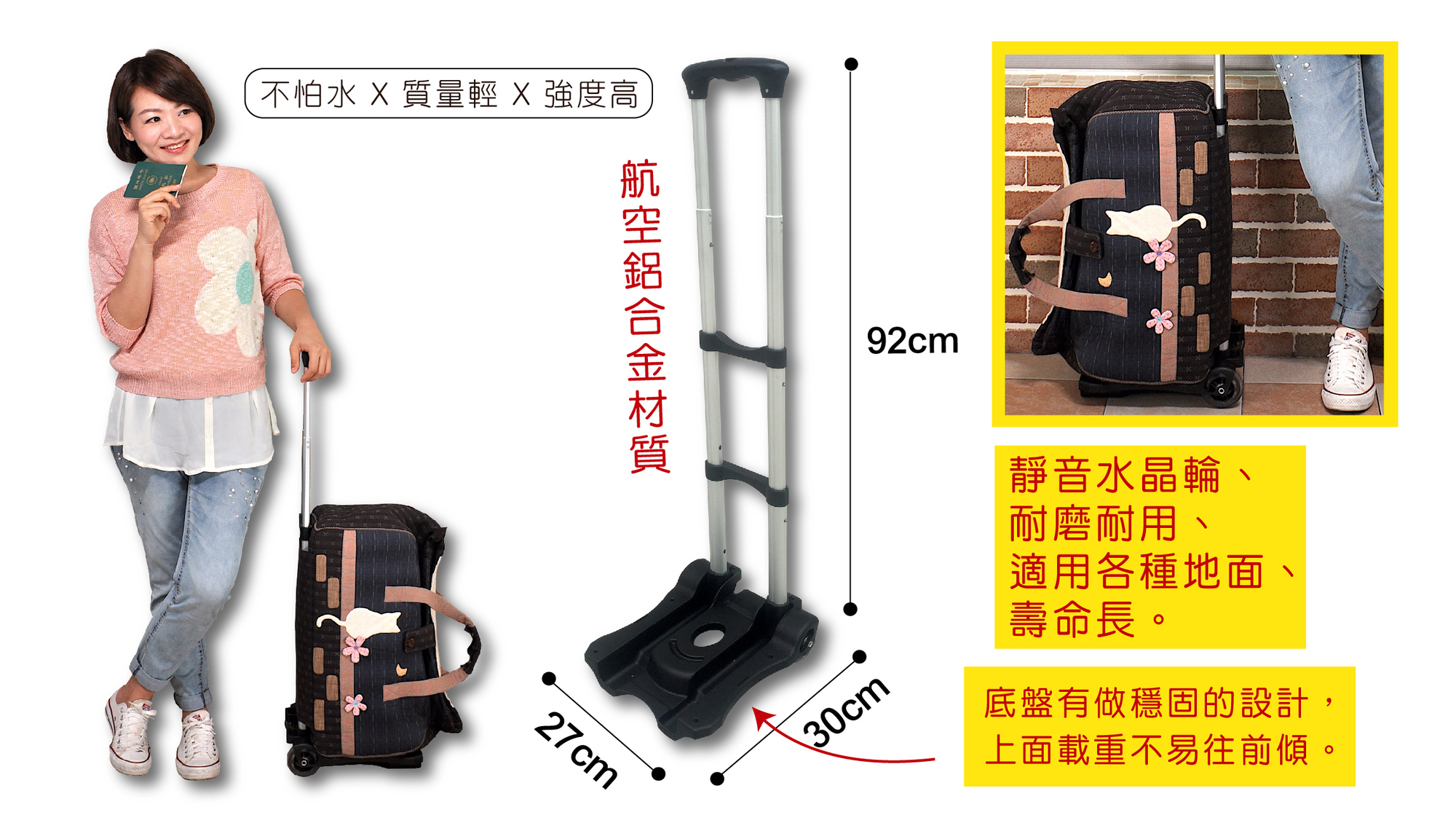 在使用這種旅行拖桿,最怕就是因為重量,然後會拖到一半不平衡,然後翻過去,在這個材料包設計時我們有考慮到囉!本身拉桿底是做寬的,前方下方還有一個支點,放著也不會翻車,然後放在拉桿中的那個固定地方,也做比較剛好,這樣就不用擔心會翻車