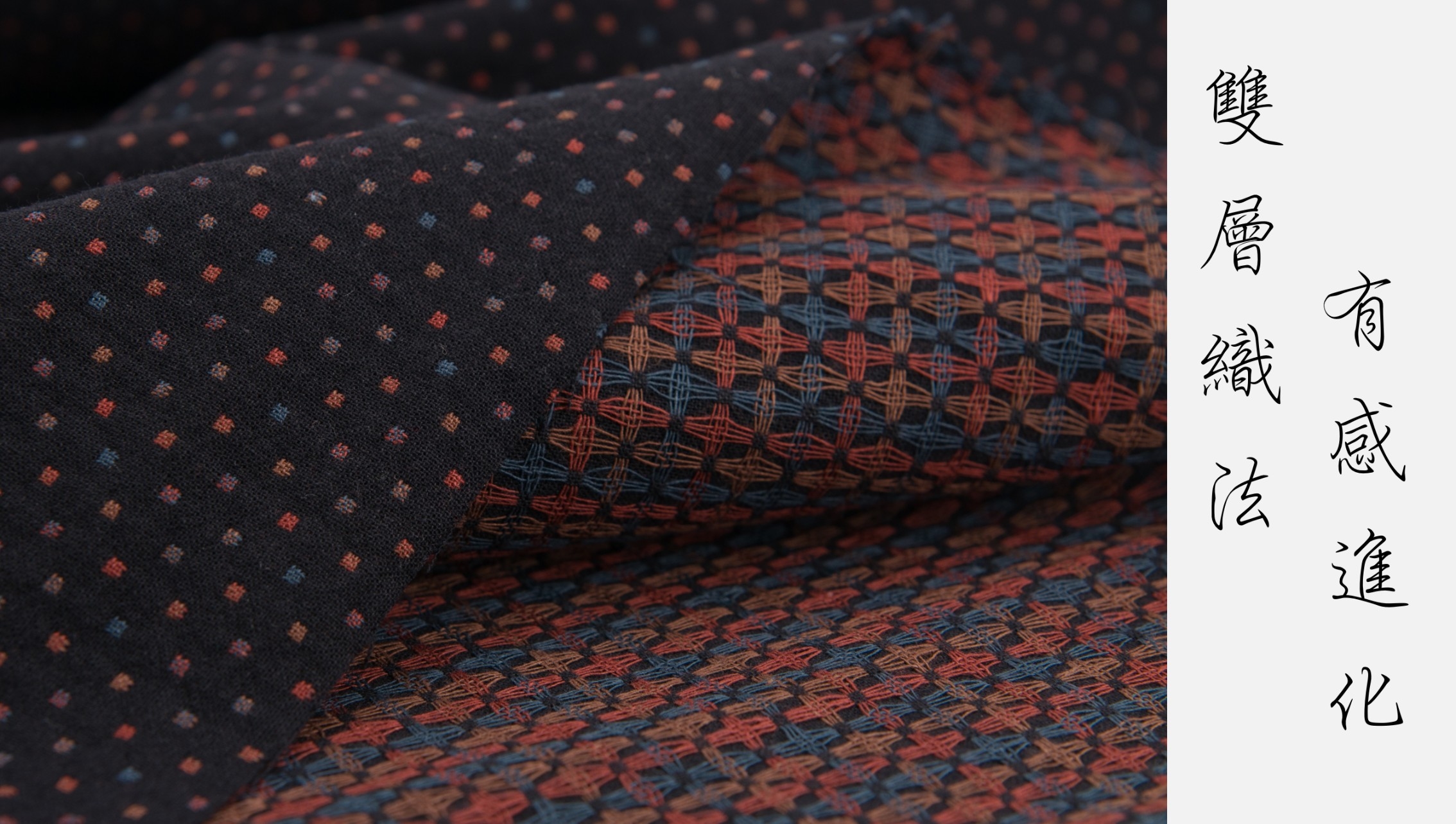 歐洲進口機器,運用雙盤頭,將經紗分成兩部份,透過經緯交織,將先染布料的點綴色增加了,成品布料,應用範圍更廣泛