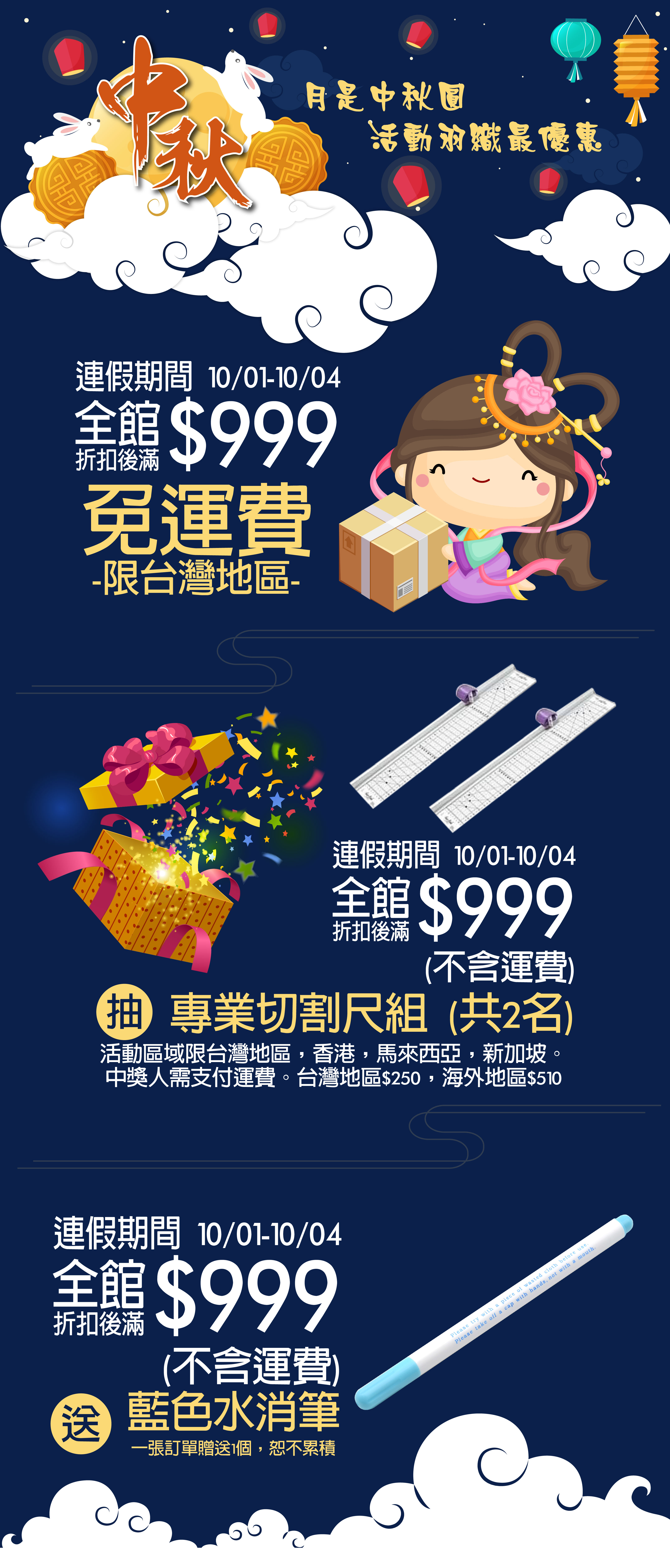 全館消費,折扣後滿$1500,台灣地區免運費
