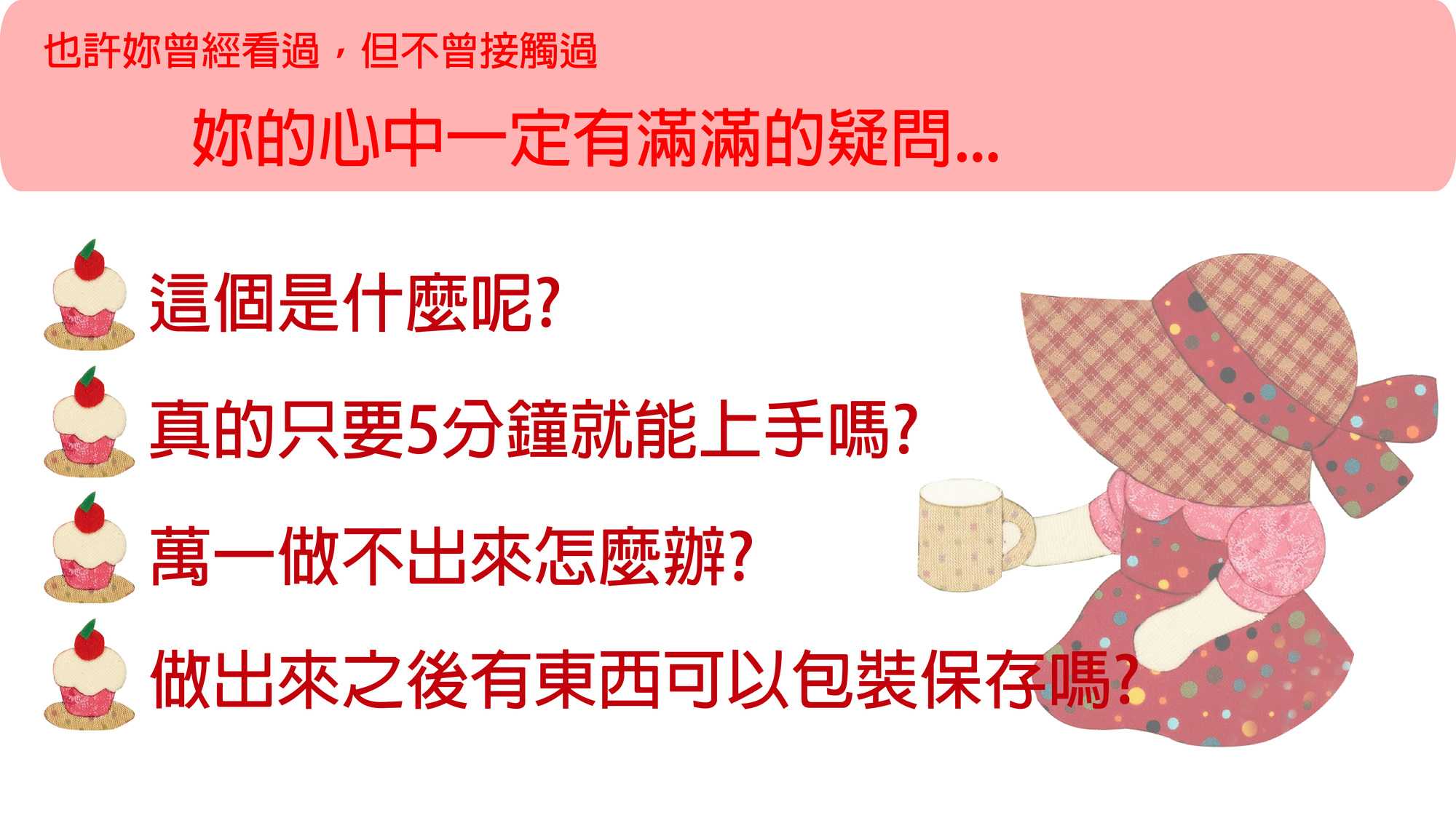 在這邊我想要說,如果沒有開始動手做,絕對沒有完成的機會,材料包跟食物不一樣,他是沒有保存期限的,只要你願意動手做,那我們一定會協助你去完成