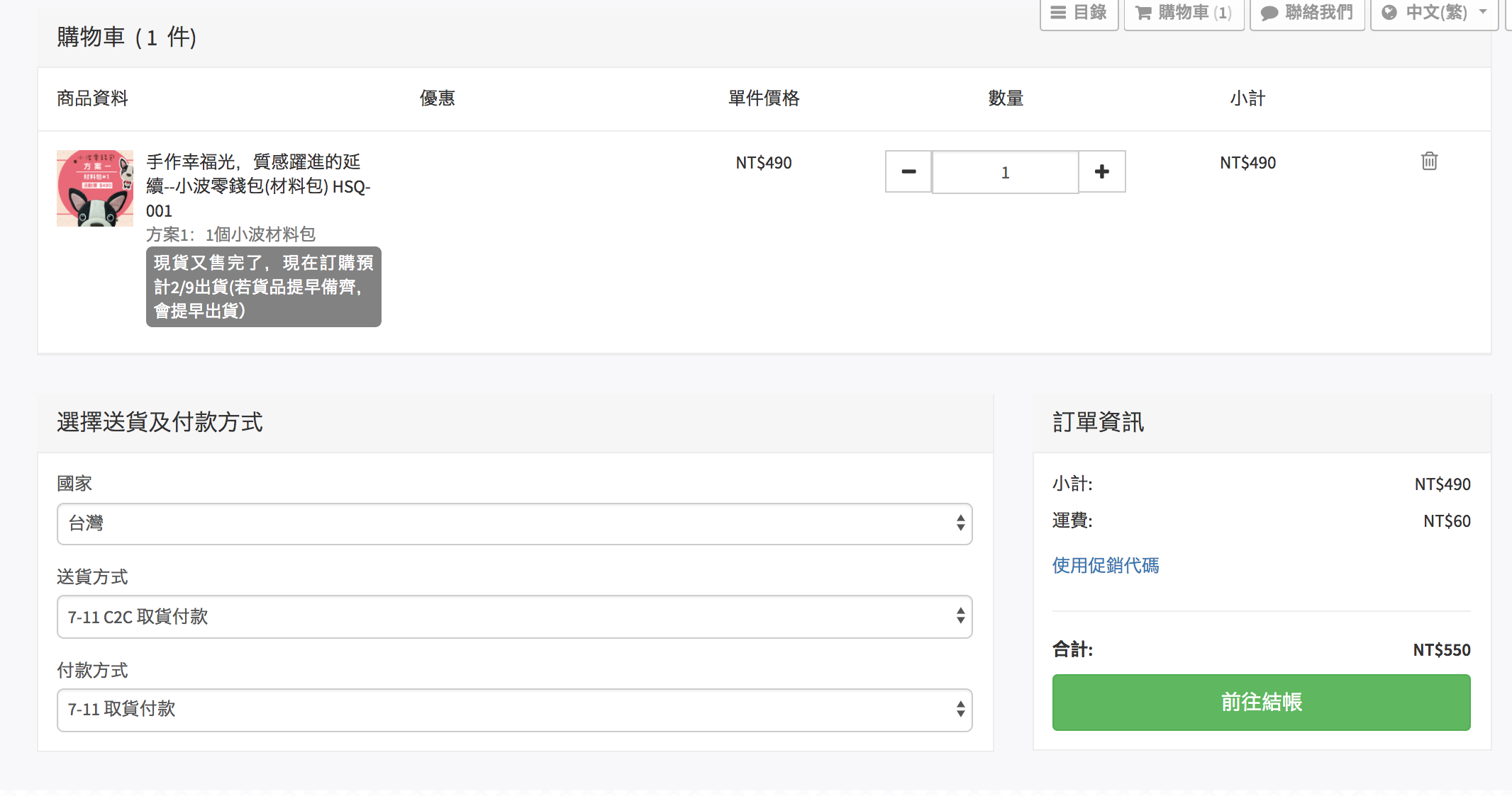 請再次確認數量與品項,並且若有要使用促銷代碼,也是在這個網頁喔,在畫面右下角有一個(使用促銷代碼),點擊下去就可以做使用