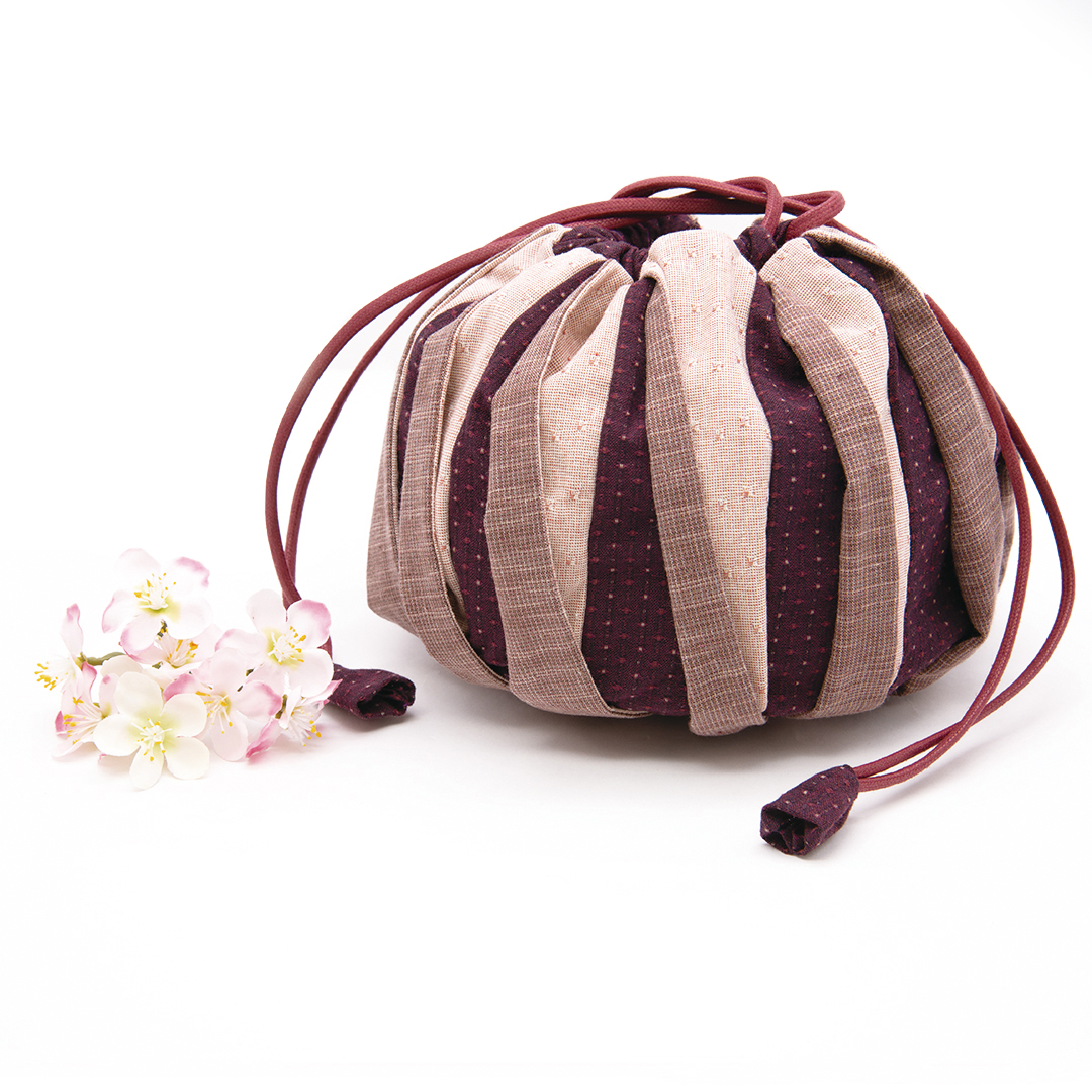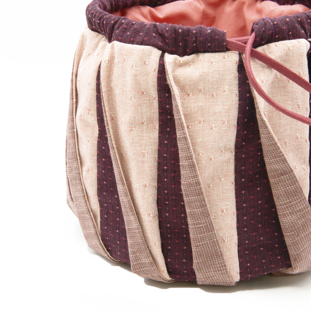 運用三種布片、再加上特別車縫方式,讓束口袋的外表有著立體的造型。