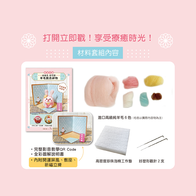 專為初學者量身打造的羊毛氈體驗組,內含完整的材料及工具,以及QRCode全程示範影音教學,一打開就能立即享受DIY手作樂趣!