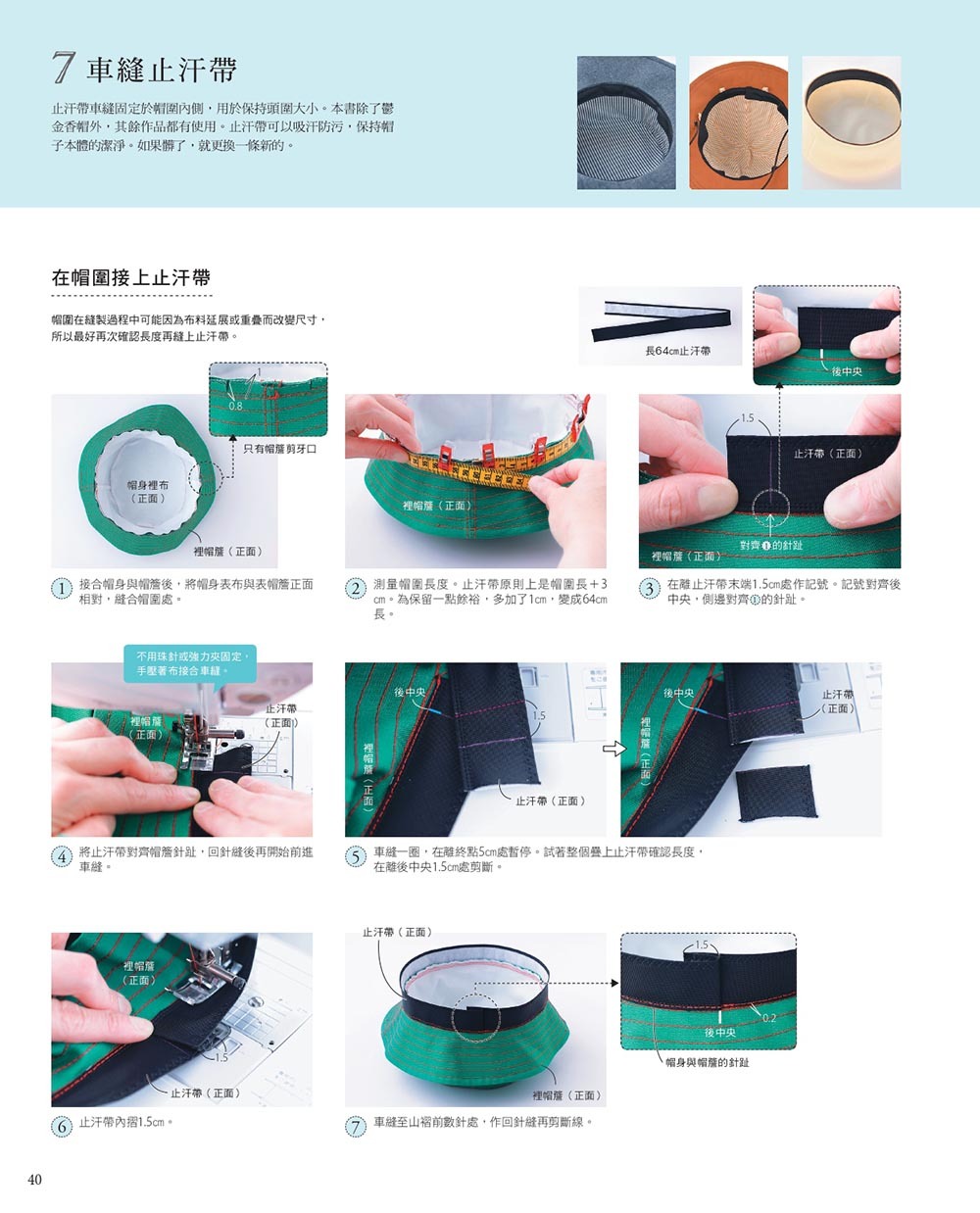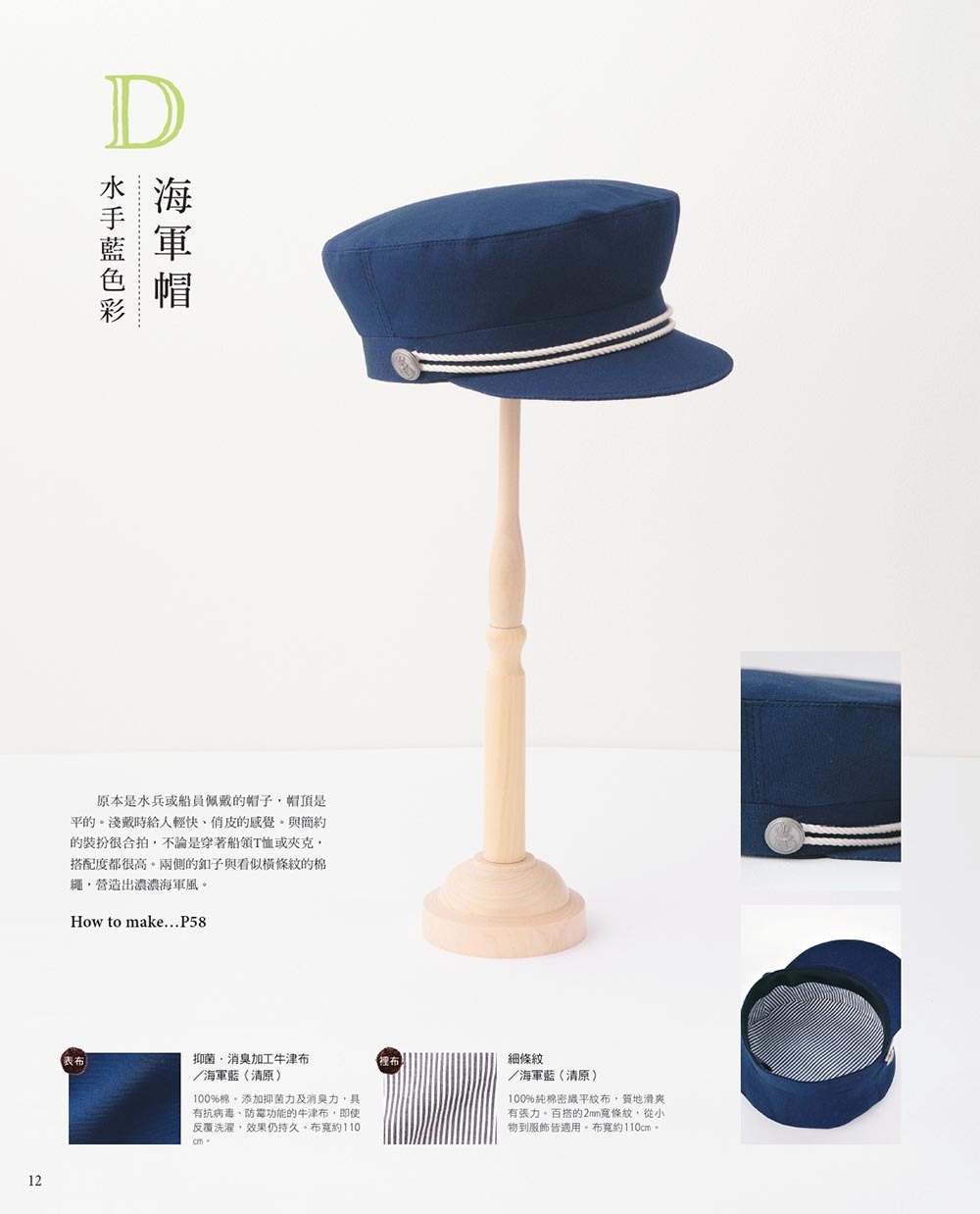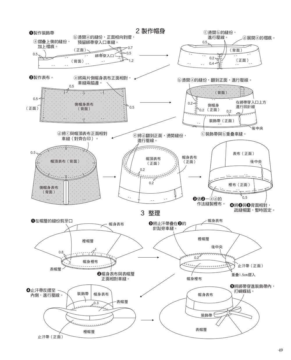 雖然有許多弧度曲線,要製作出滿意的帽子,可能一開始並不容易。但帽子的製作流程基本上是大同小異的。在實作中磨練各種技巧,自然地就能縫得整齊又漂亮!你也來挑戰看看自己製作的樂趣吧!