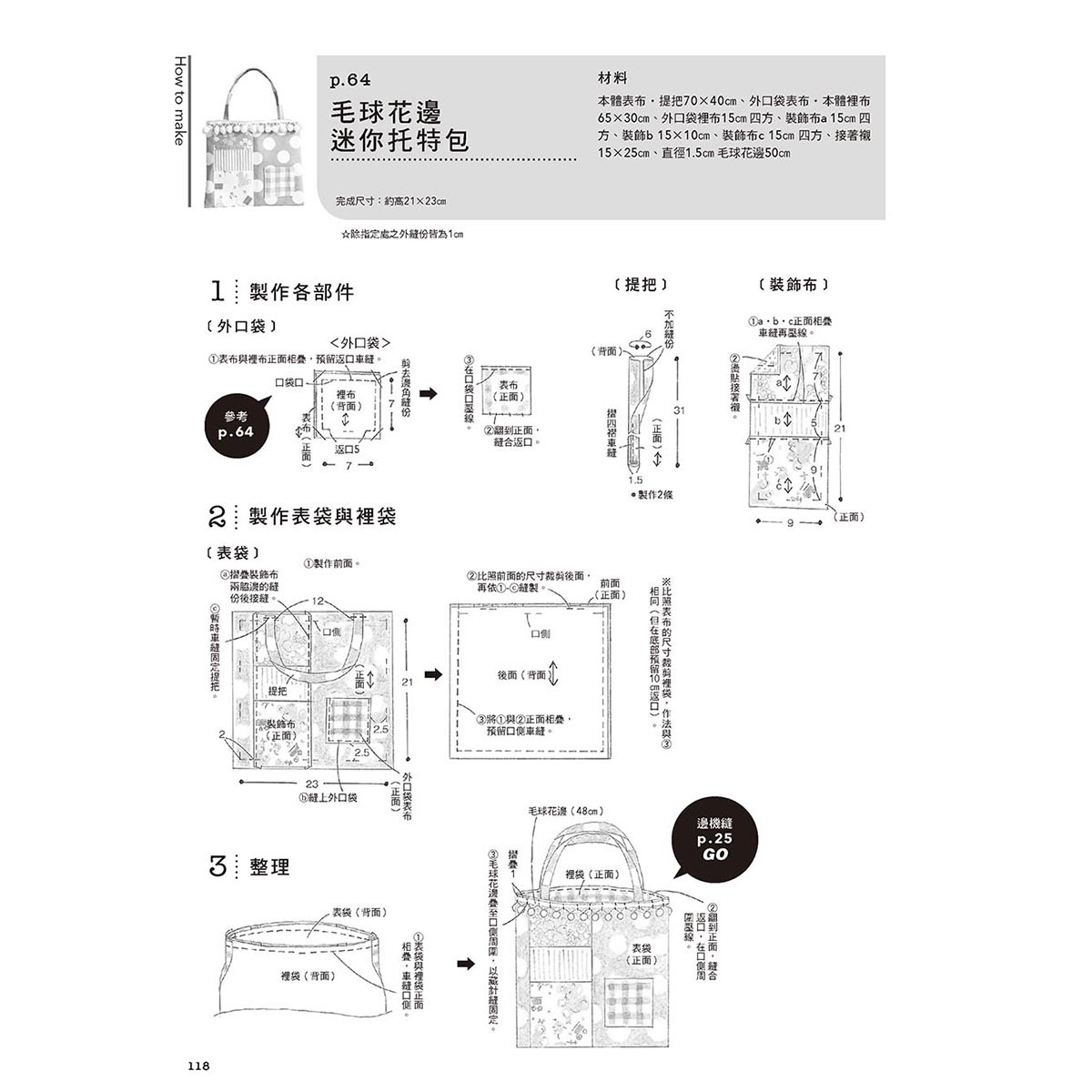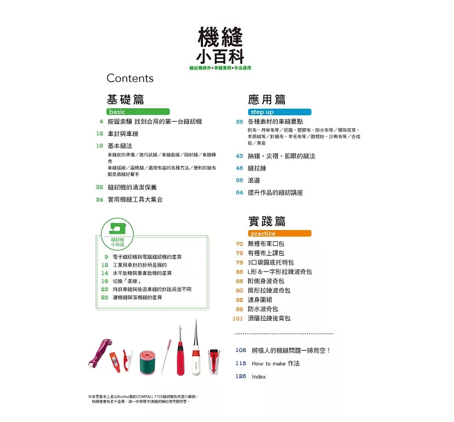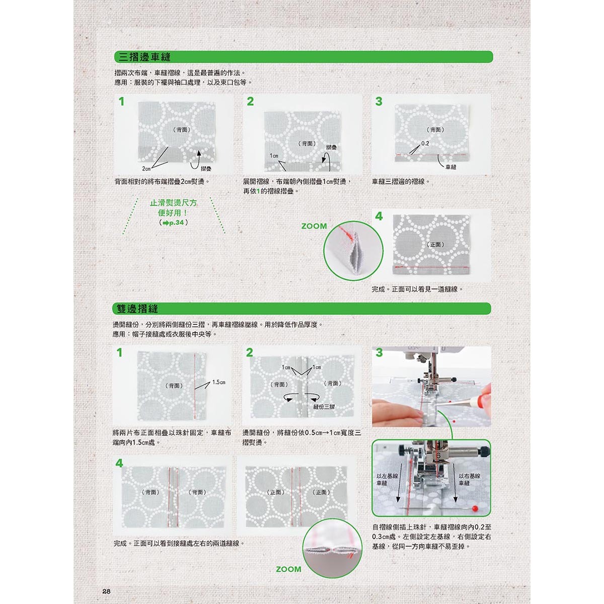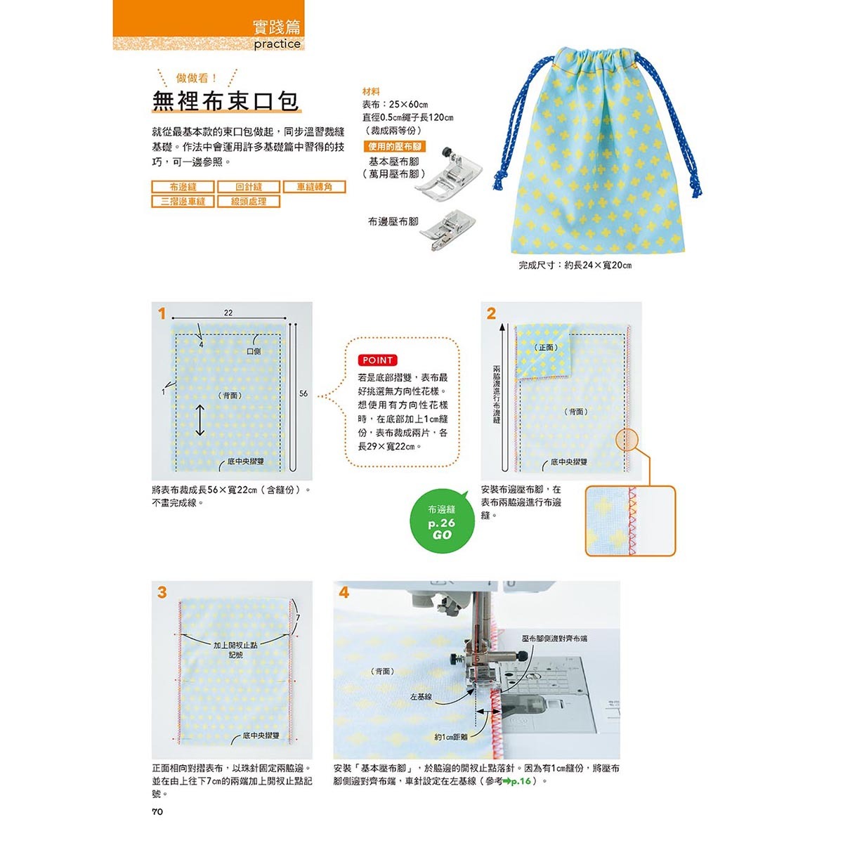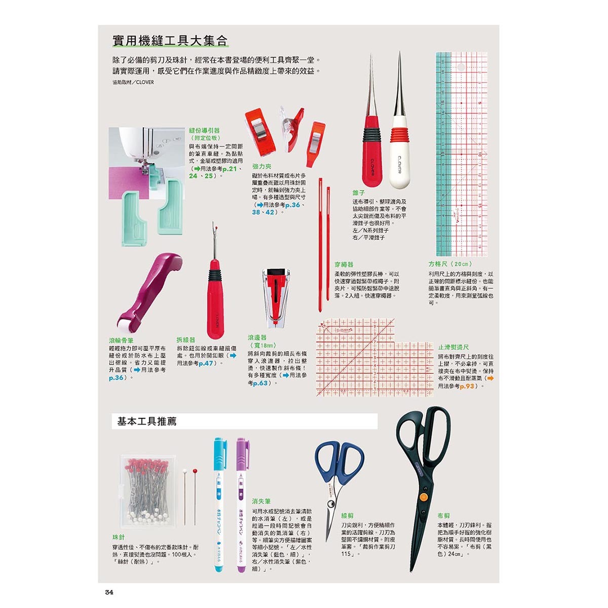 本書從縫紉機的種類與功能開始介紹,並將各種針法及車縫方法搭配專用壓布腳。以實際的作品來說明部分縫的製作方法:圍兜兜、手帕、方底包包、圓底包包、束口袋、托特包、拉鍊包、圍裙、後背包……不只單純學習部分縫的作法,也能馬上應用到成品上,學習起來更加有成就感!