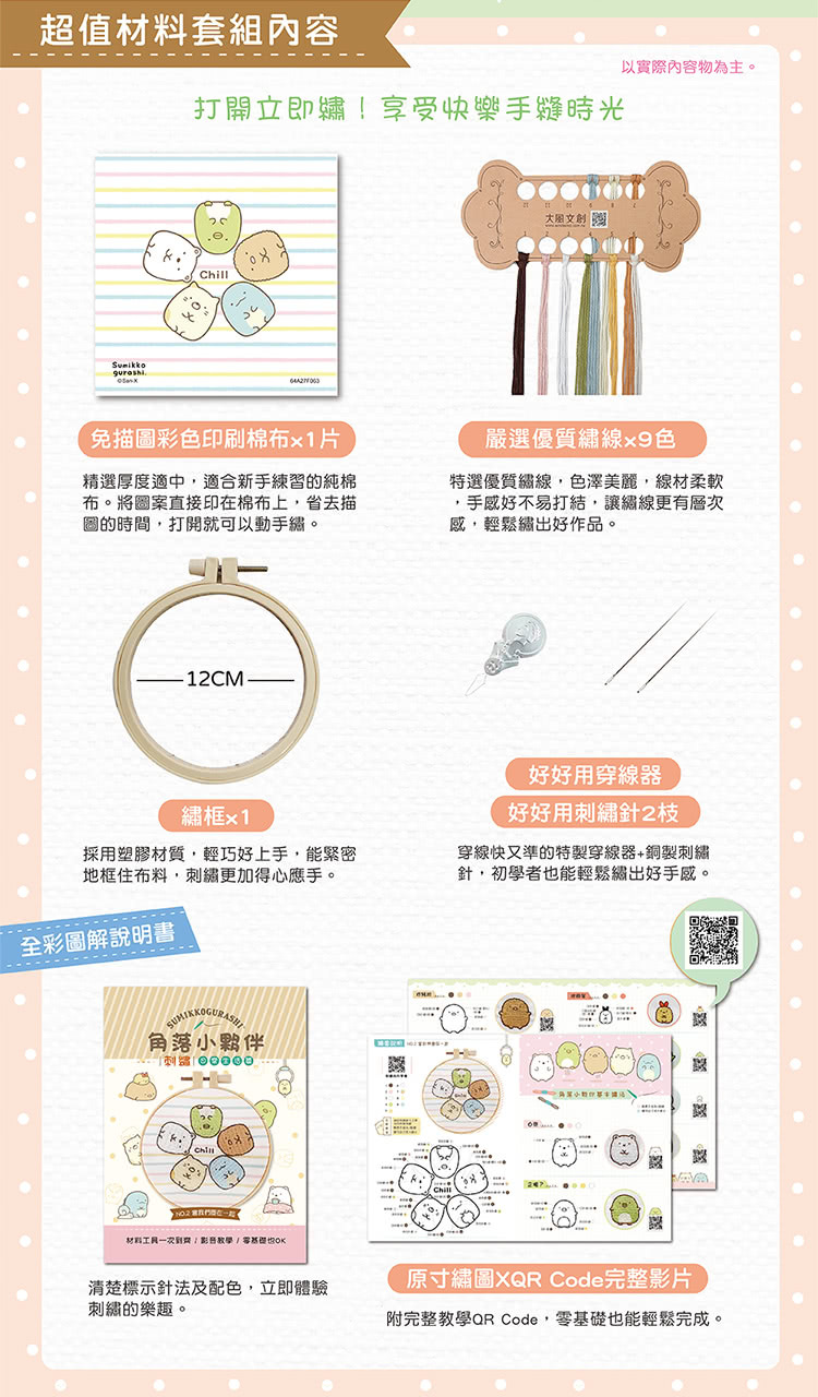 專為初學者量身打造的刺繡體驗組,內含完整的材料及工具,以及QRCode全程示範影音教學,一打開就能立即享受DIY手作樂趣!