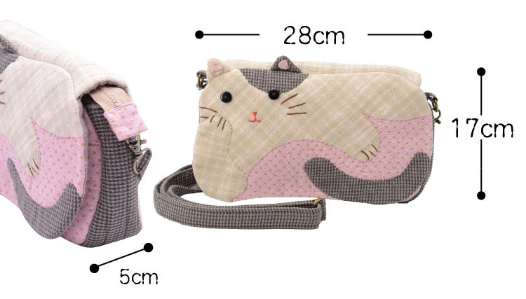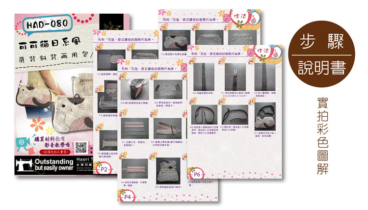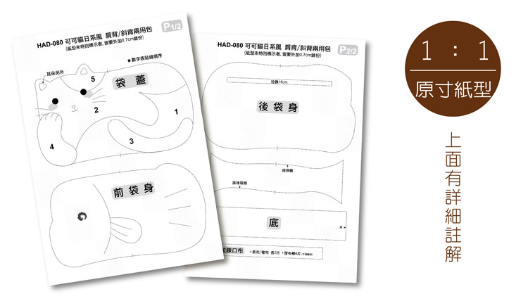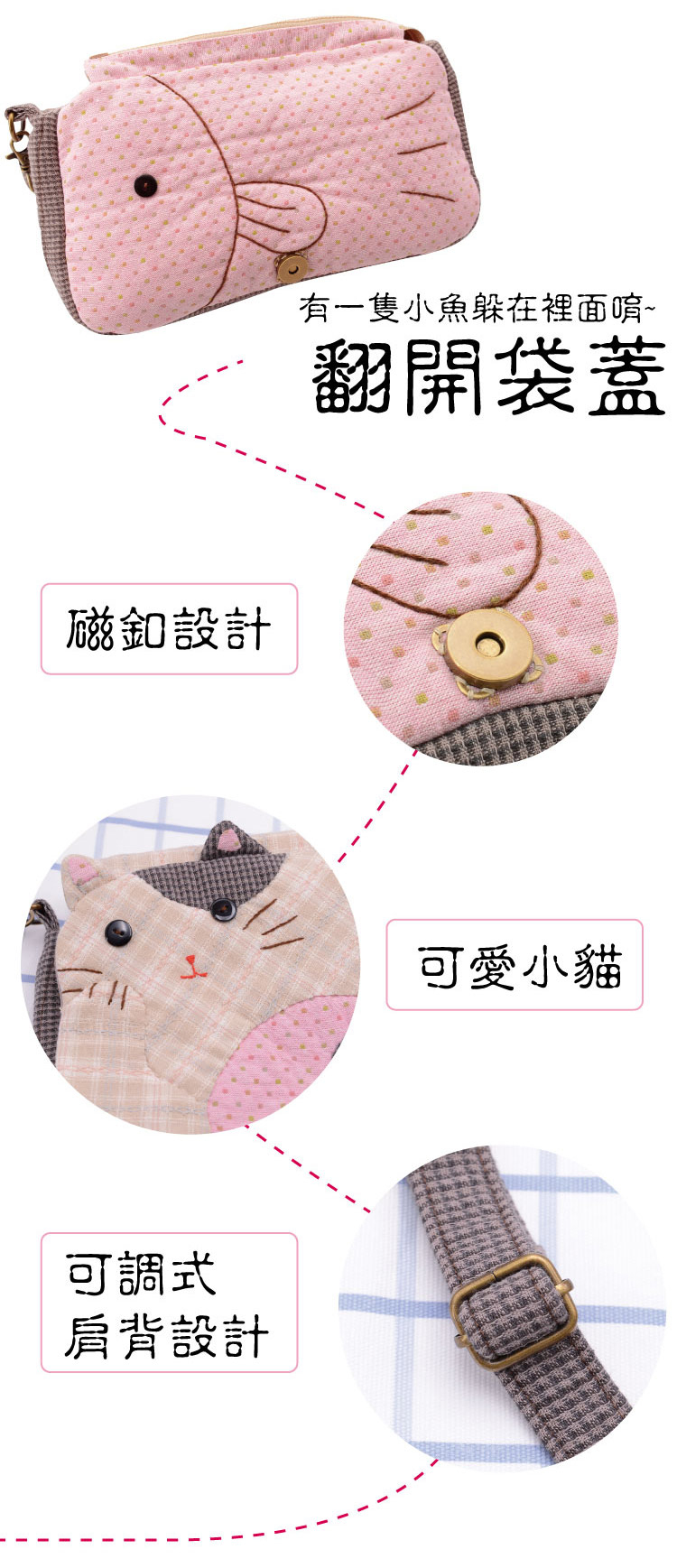 打開袋蓋有小巧思,是貓咪最愛玩耍的夥伴,小小魚,前端運用圖像,讓整體袋物除了可愛,多了一分特殊感,整體的材料包走向就是可愛,典雅,卻不掩青春,背上吧!