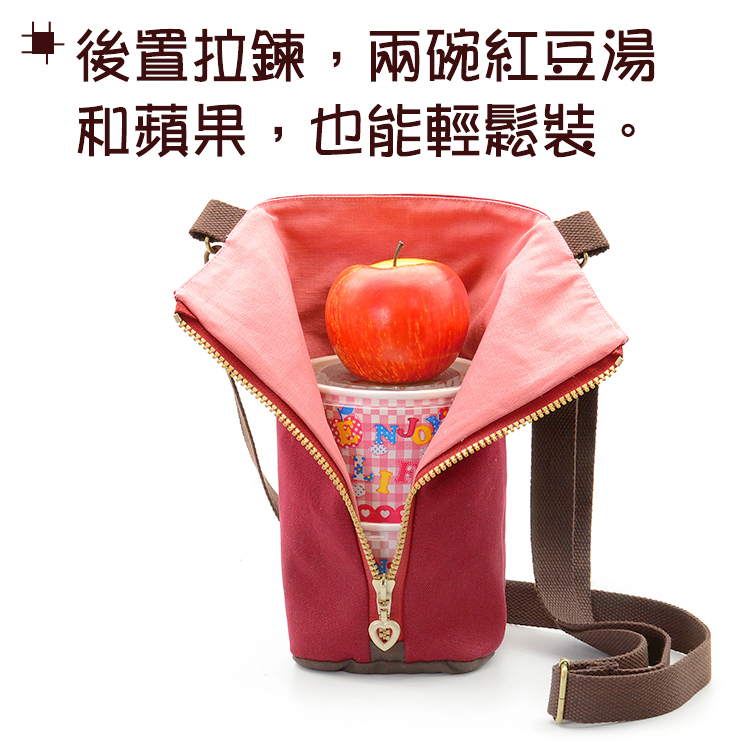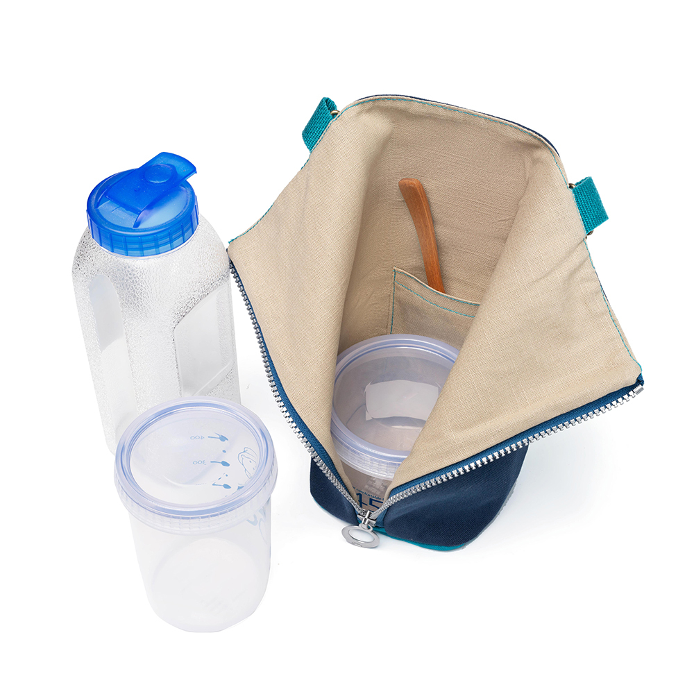 A zipper on the back of the bag makes it easier to store and access items. It can easily accommodate containers of various heights and shapes. Inside, there is a sticky pocket for utensils or straws.