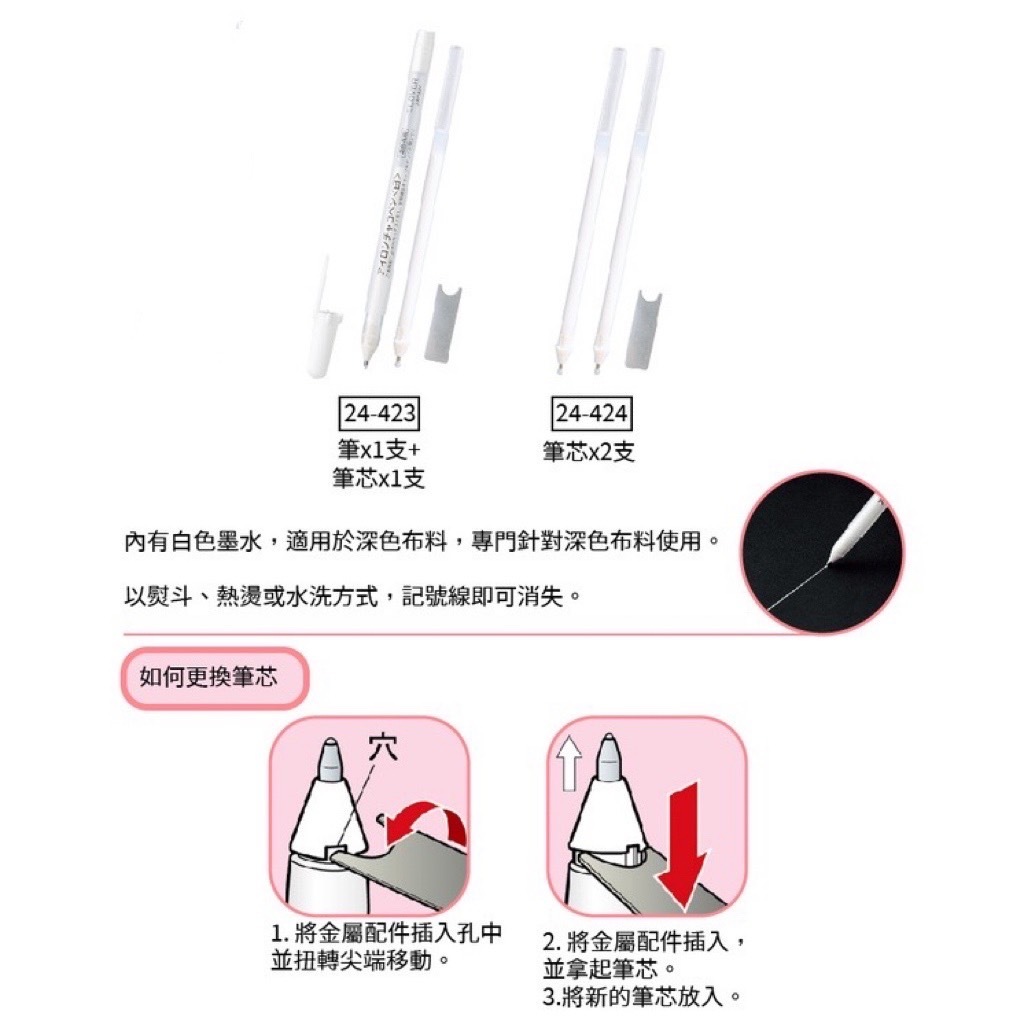 深色布上使用,數秒鐘後才會出現,不要重複來回畫線,水除了會很快用完之外,線條畫太深,記號也難較消除。